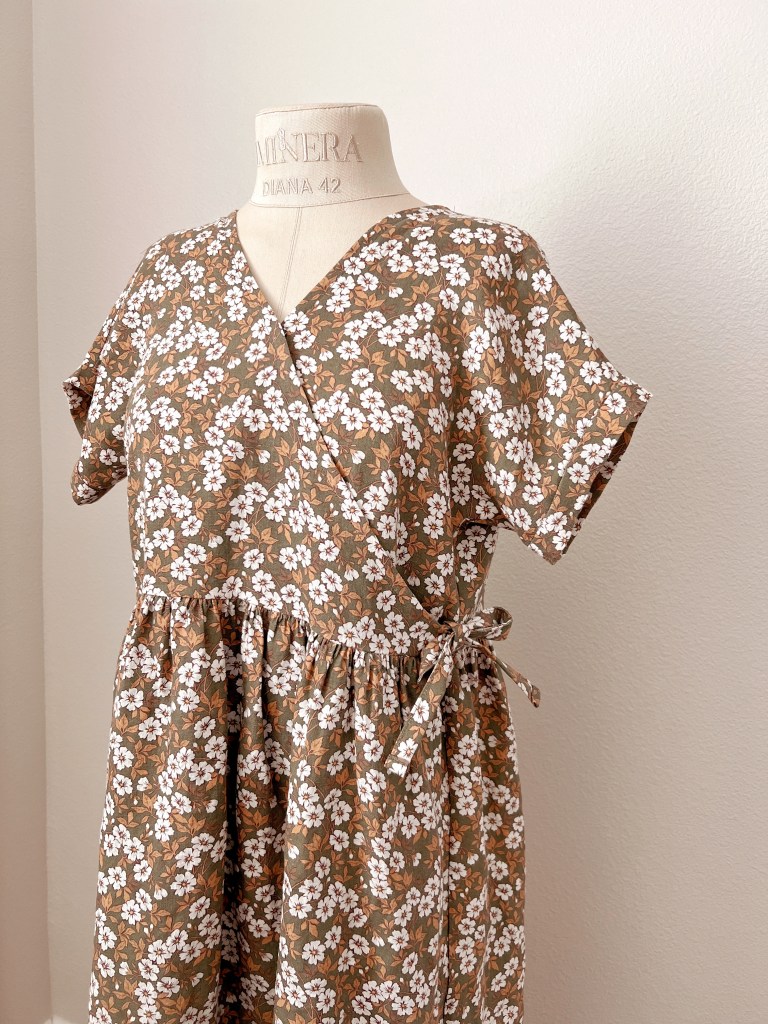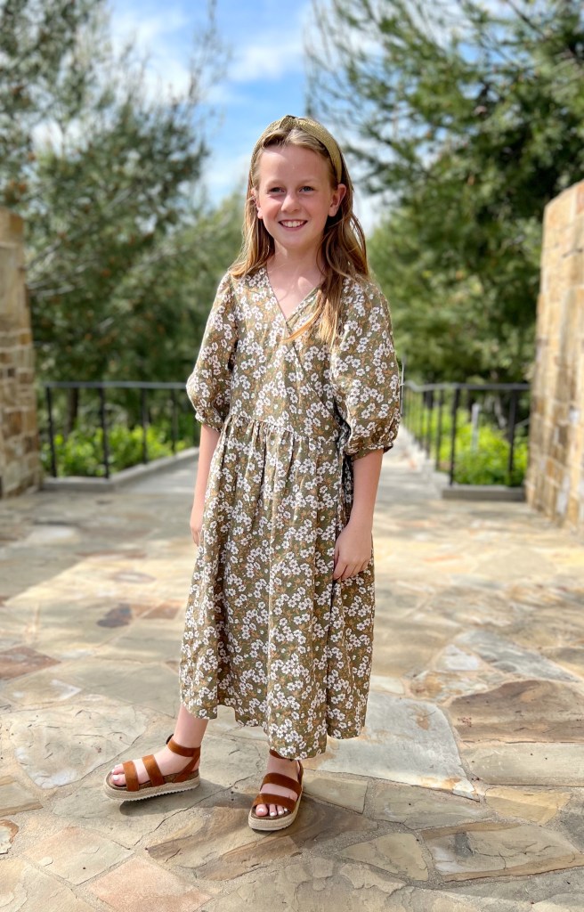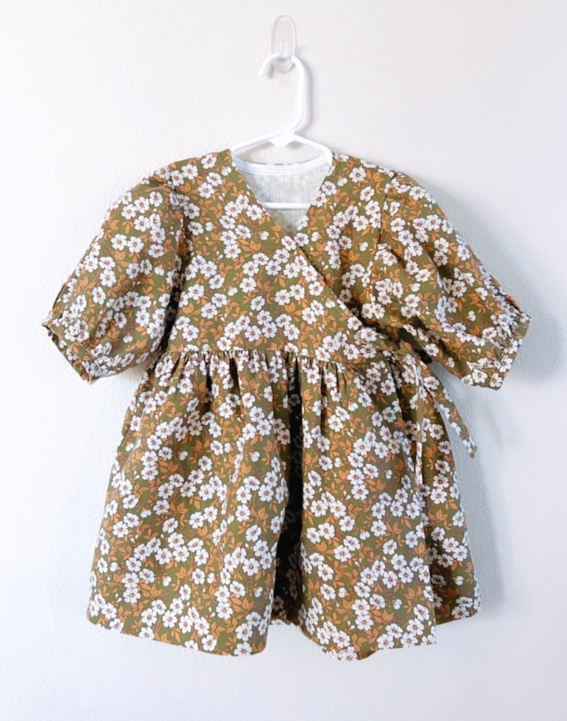 For my two daughter’s dresses I used a girls pattern I found on Etsy. The Dora Dress by Coturinha. It comes in sizes 3 months to 10 years. I made size 2 for my 18 month old and size 10 for my 9 year old. I usually size up a little in kids clothing so it will last longer. I made the wrap dress version with 3/4″ sleeves. I also extended to the top tier of the skirt and omitted the second tier. I had to cut a few pieces (like the sleeve and skirt pieces for example) not on the foldline due to underestimating the amount of fabric I ordered, I added 1/2″ for seam allowance and it turned out great. The bodice of this dress is designed to be made with a bodice lining, which finished the neckline edges. I didn’t have enough fabric for this so I finished mine with bias tape and made a little facing for the tie edges to finish it nicely. I’ll share how I did this below!