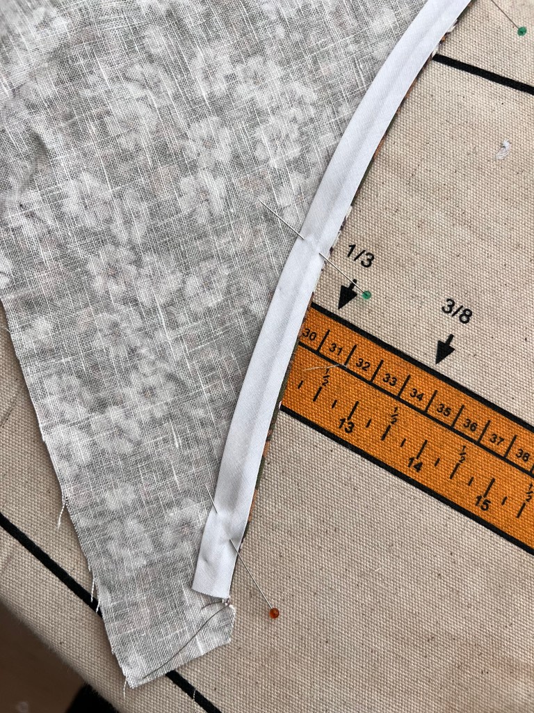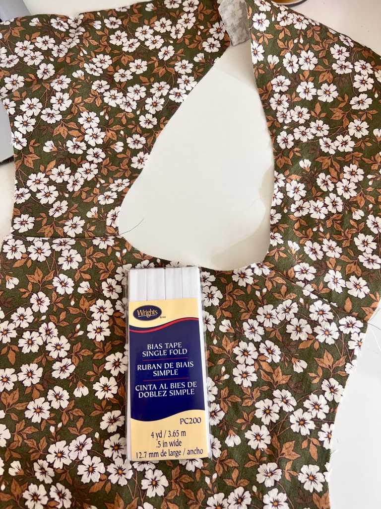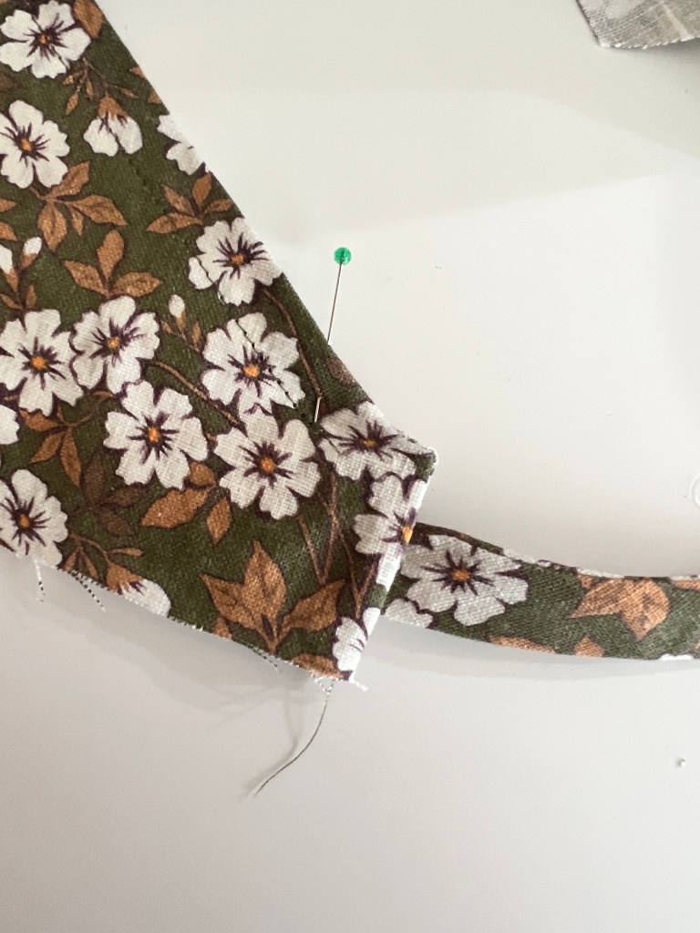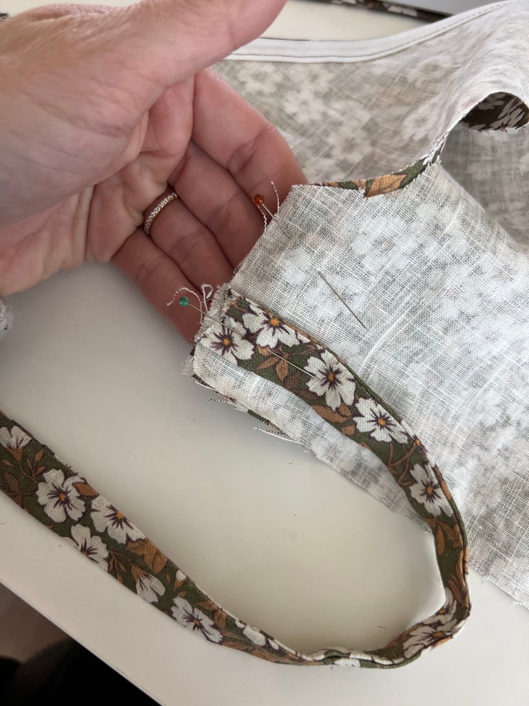 - Using pre-made single fold bias tape, open up bias tape and pin one edge to neckline edge. Stop about 1-2″ from the edge as shown below.
