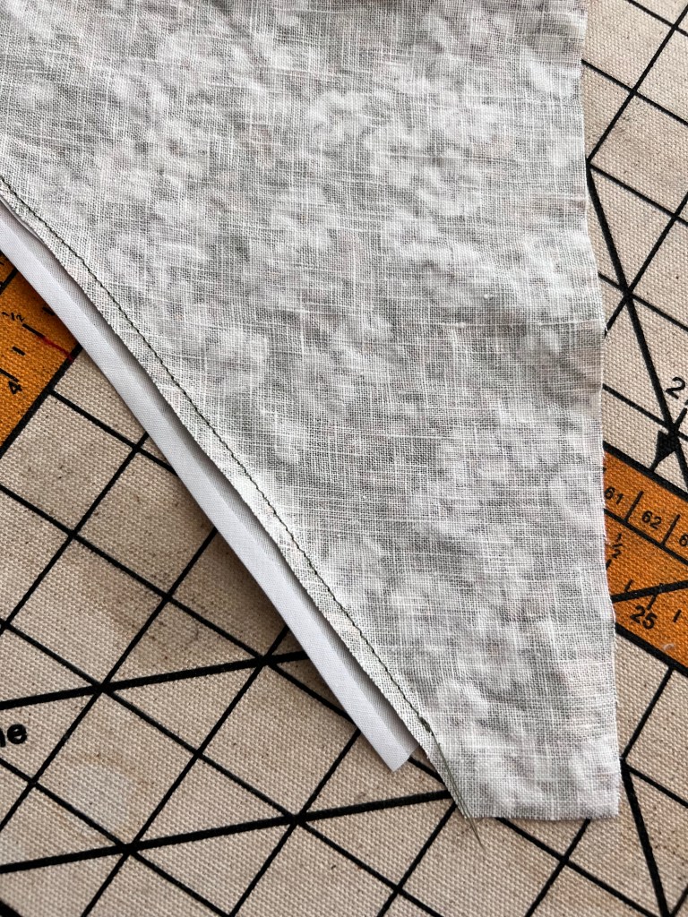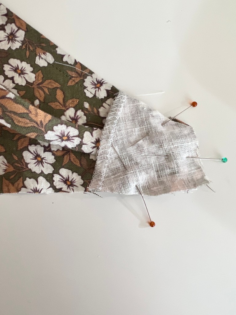 4. Next, cut out a piece of scrap fabric that matches the shape of the bodice edge. Serger or finish the inside long edge, and pin right sides over the bodice and tie.