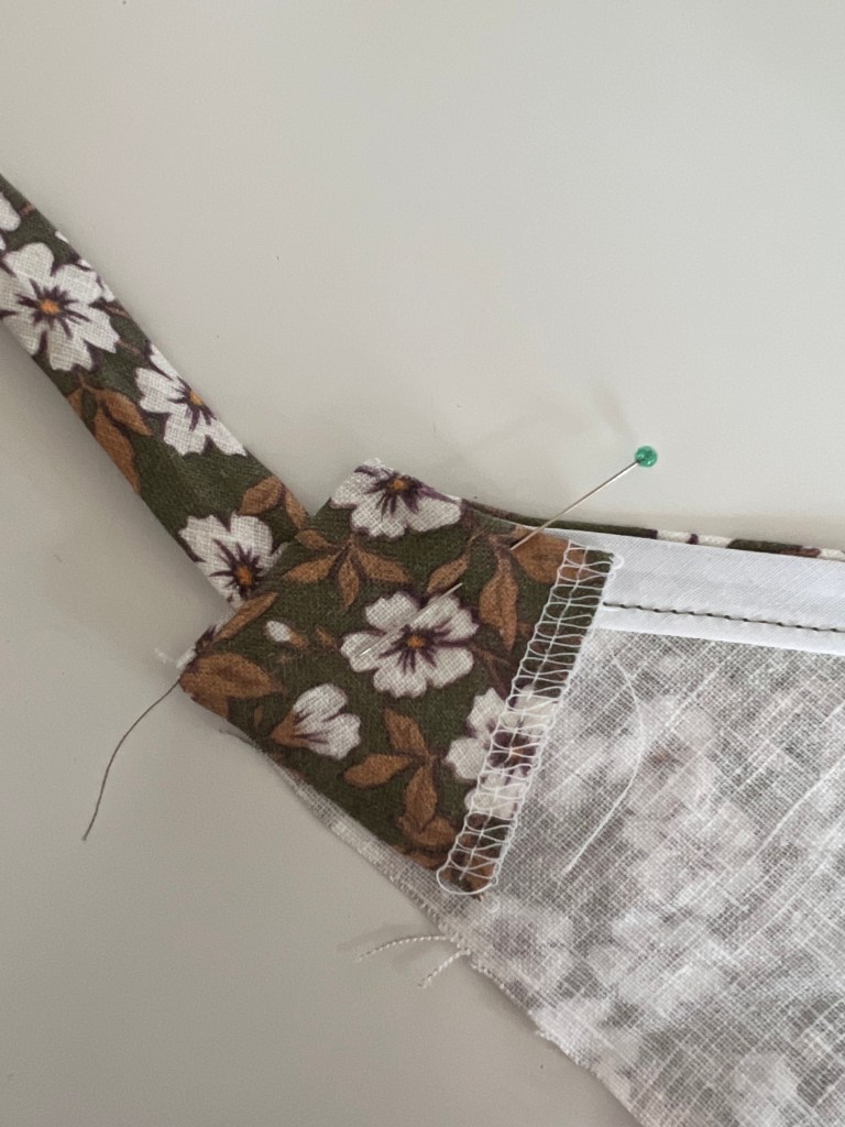 5. Sew along the top edge beginning where your previous stitching ended and down the side edge over the tie. Trim the corner edge and flip right sides out. It should look like the first picture above. Hand stitch the top edge in place to cover the bias tape raw edge where pin is shown in second picture above,