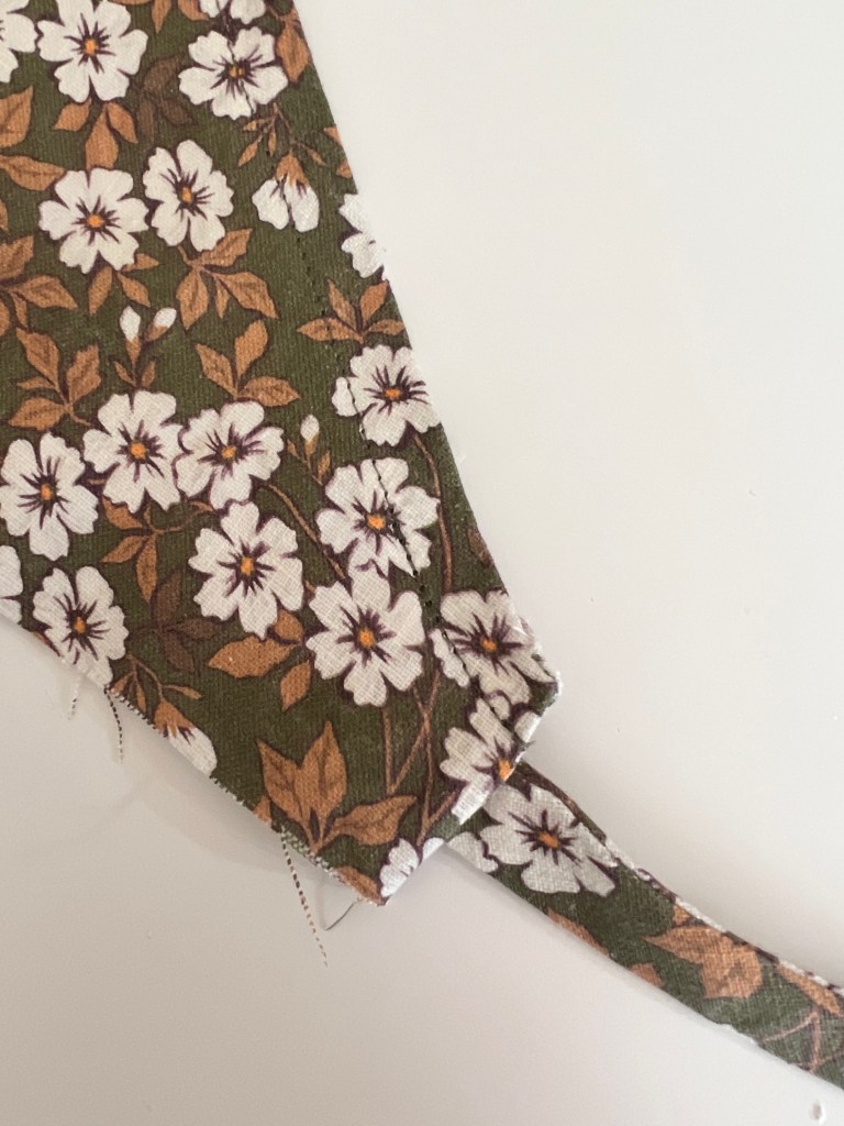 For my dress I used the All Well Box Top Wrap Dress Hack. Using the All Well Box Top Pattern size 1, I followed their tutorial to make the wrap dress. It was very easy to follow and hack. I did find that I had to adjust the bodice after my first go at it, the front ends were way too long for me, I probably trimmed 3-4″ off to get the right fit. I ended up unpicking everything after my first take and re-drawing and trimming the neckline and bodice ends- but its turned out really great!! If you have the time and resources I would suggest making a muslin of the top of the dress to save yourself some time. It took me a few tries to get it just right. I extended the arm sleeve by 2″ suggested in the original hack instructions. I also lowered the underarm seam by 2″, a suggested tip from Bethany. (I fell in love with her version of this dress- go check it out!). The fit is perfect for me, not too snug at all. I also added sleeve cuffs like Bethany’s dress. There are instructions for how to do this in the pattern. Unlike the hack instructions provided, I made a little facing for the front tie edges of the dress, and I’ll share how I did that below. I actually used the same process for all three dresses.