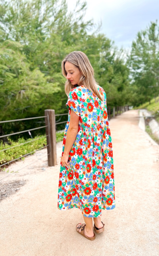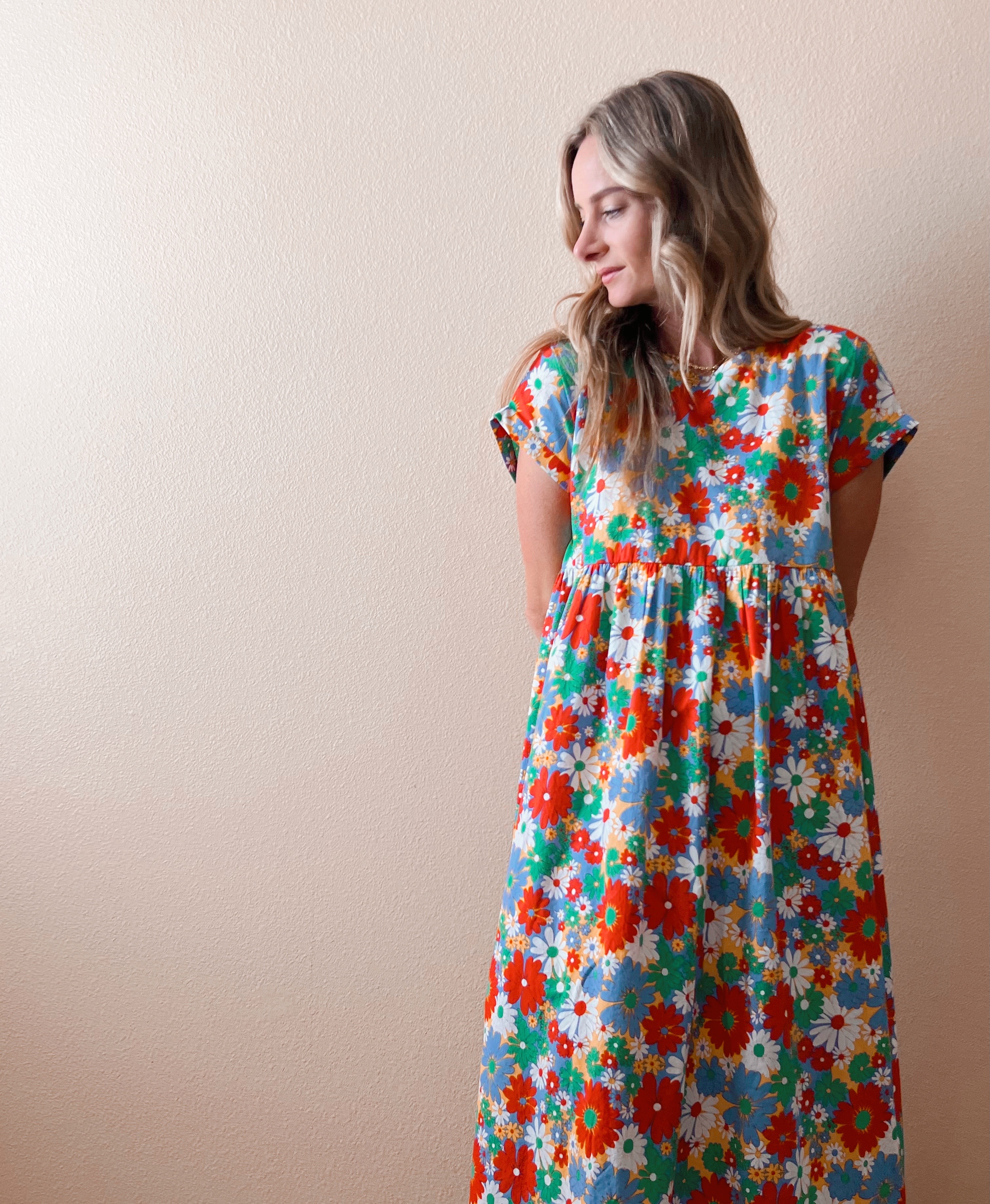 Back to this dress! I’ve had this fabric for a few months. For a while it was going to be a blouse, but that didn’t feel quite right. Then I decided it could be a really cute button down shirt dress, but that also didn’t feel right. I love this mod floral pattern and kept picturing a loose mumu style dress for summer. After doing some thinking I finally came to the All Well Box Top pattern I recently used earlier this year. You can see it here. I love this pattern because it provides so many different style options. It’s also very beginner friendly!