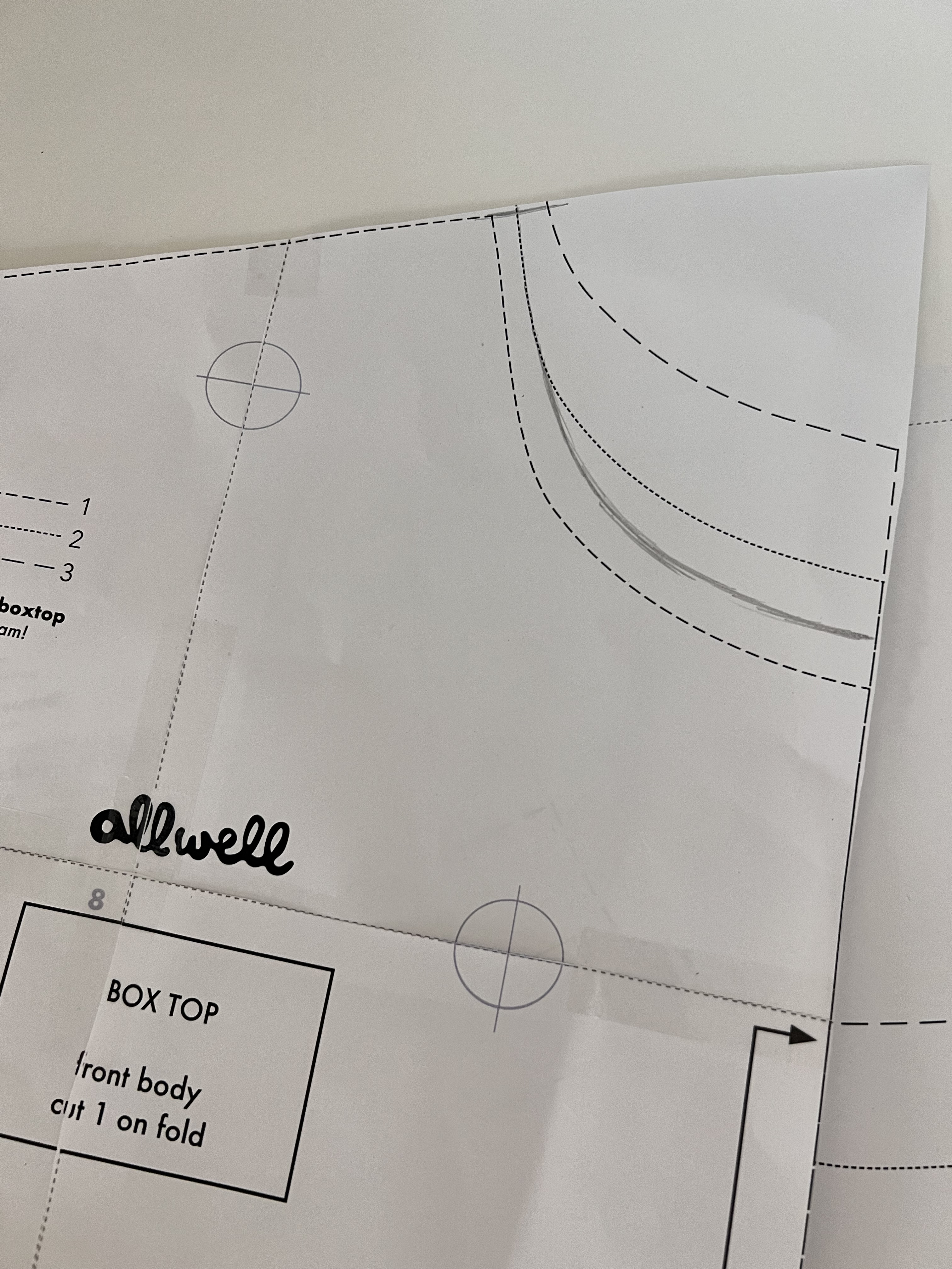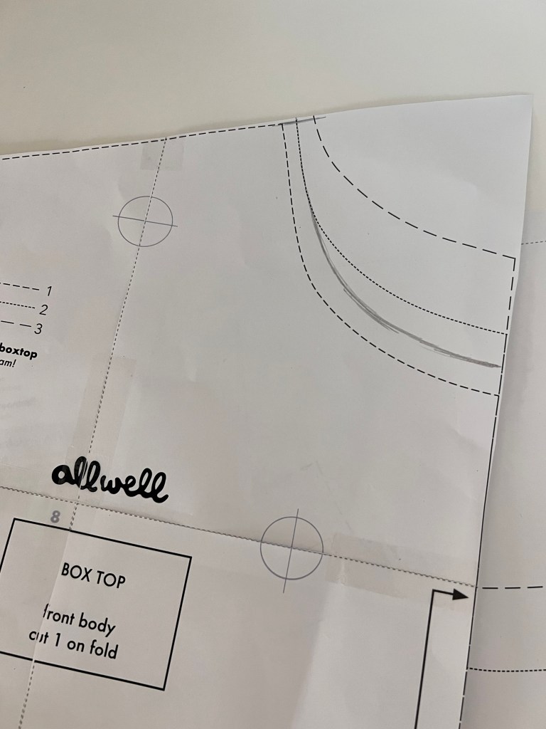 I made a few alterations using the basic box top pattern. I used size 1. I cut the bodice at the “cut here for ruffled top” point. I also extended the sleeves out by 1″. Then I added a gathered skirt piece, (to make this I used the ruffle extension pattern piece and added my preferred length). I also created cuffs and followed the pattern directions to construct those. Directions for the cuff pattern piece and construction can be found in the box top pattern guide. I also brought the neckline in about 1/2″ along the shoulder/neckline as shown below.