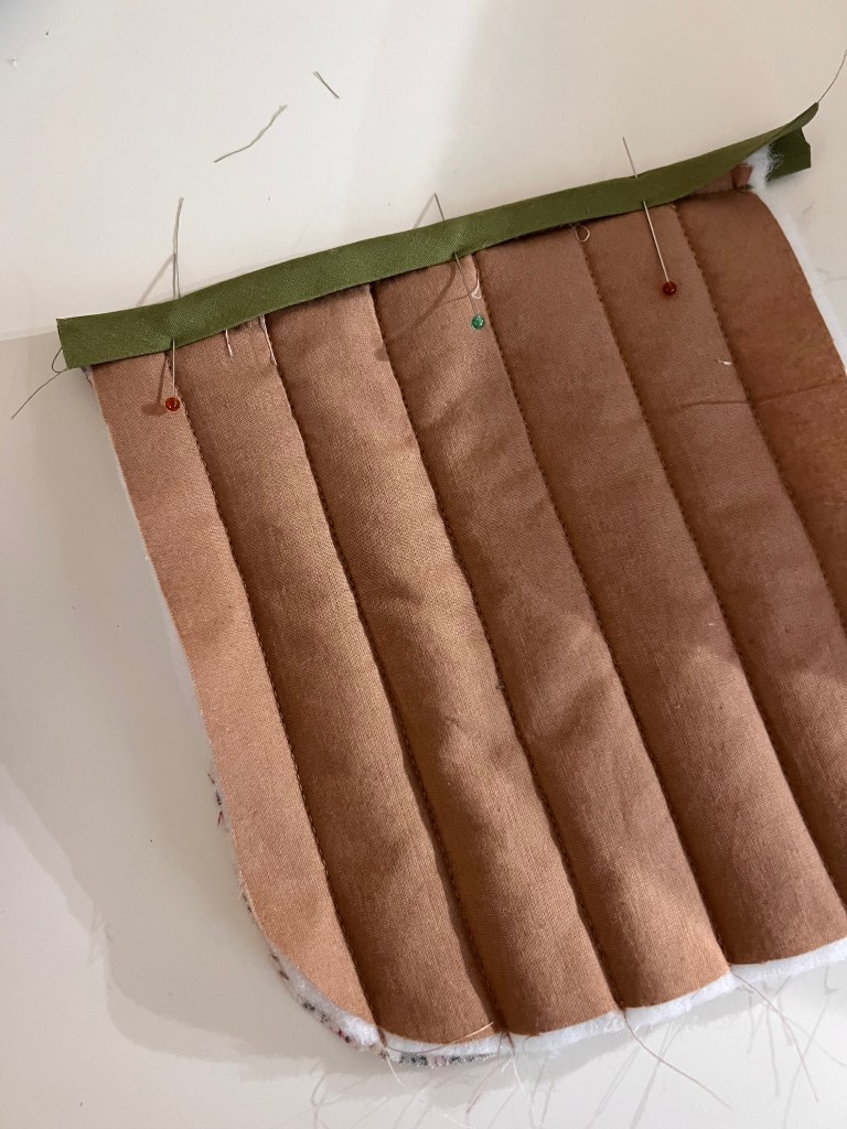 First, quilt the pocket piece just as you did all of the other pieces. You can use a different quilting pattern here if you’d like. Then apply bias tape all around the pocket just like we did in the past steps. You can apply along the top first, and then finish around the sides like I did, or (what I should of done) is use one long piece and miter the top corners. I folded the tape under to finish my top edges. It was late and I wasn’t thinking clearly. I would miter the corners if I were you, it will give you a really nice finish. You can Youtube how to miter bias binding. Either way is acceptable. 🙂