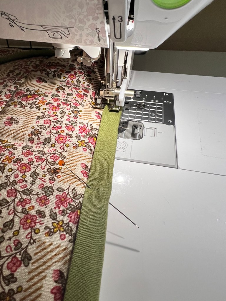 Apply the bias tape along the raw outer edge of the quilted collar. Sew in place. Flip it over and edge stitch along the top of the collar, catching the loose edge of bias tape underneath to finish.
