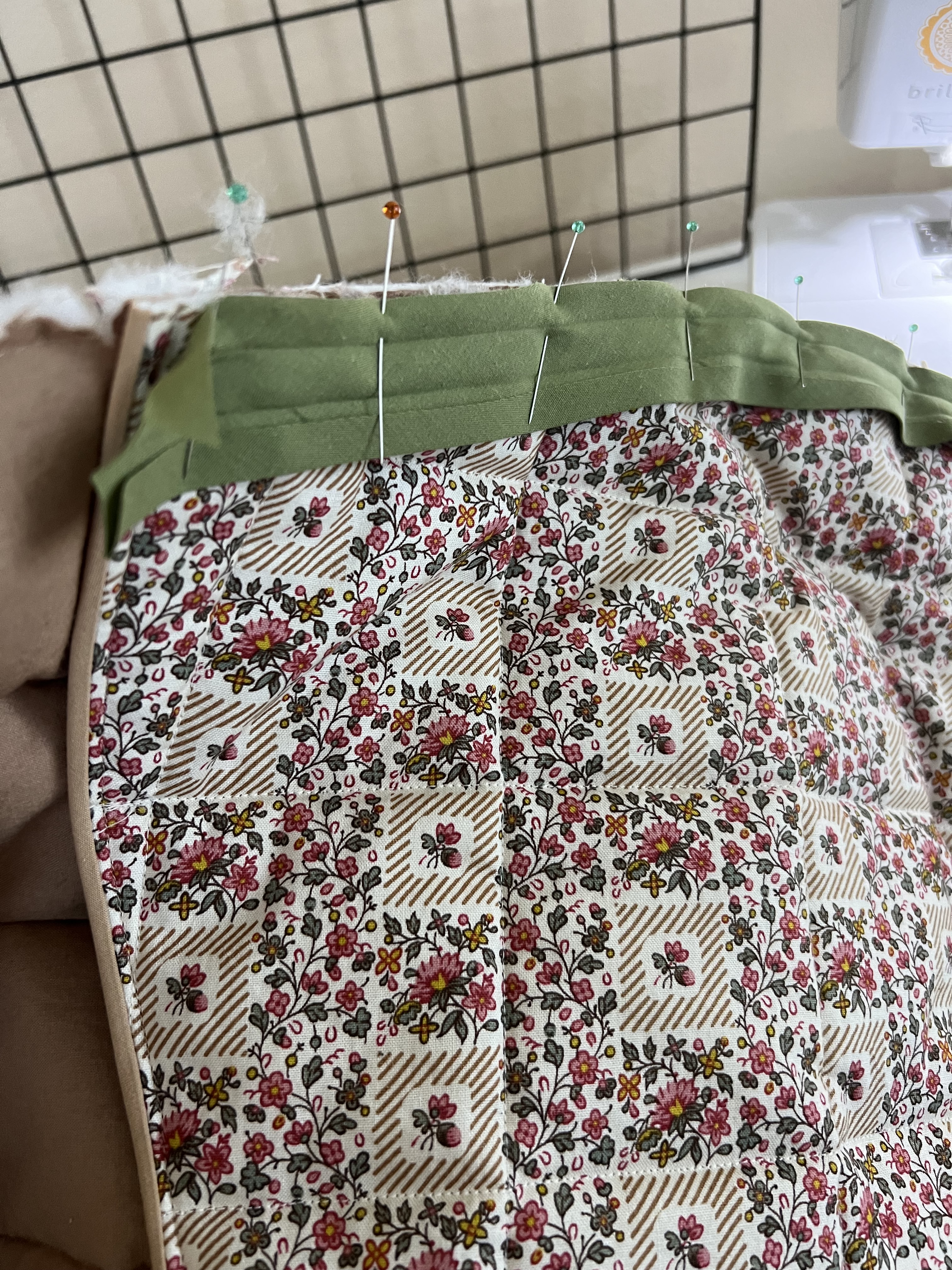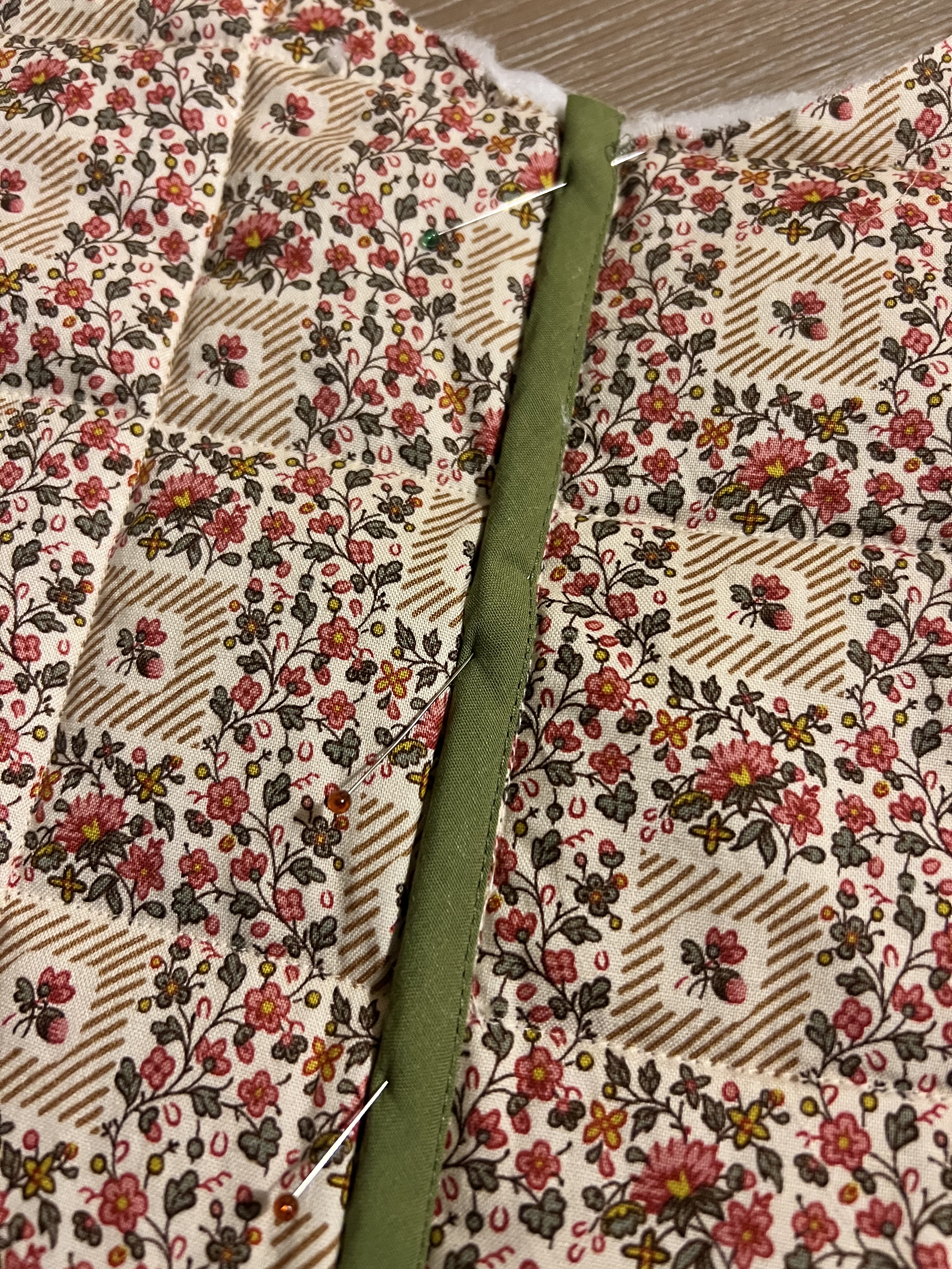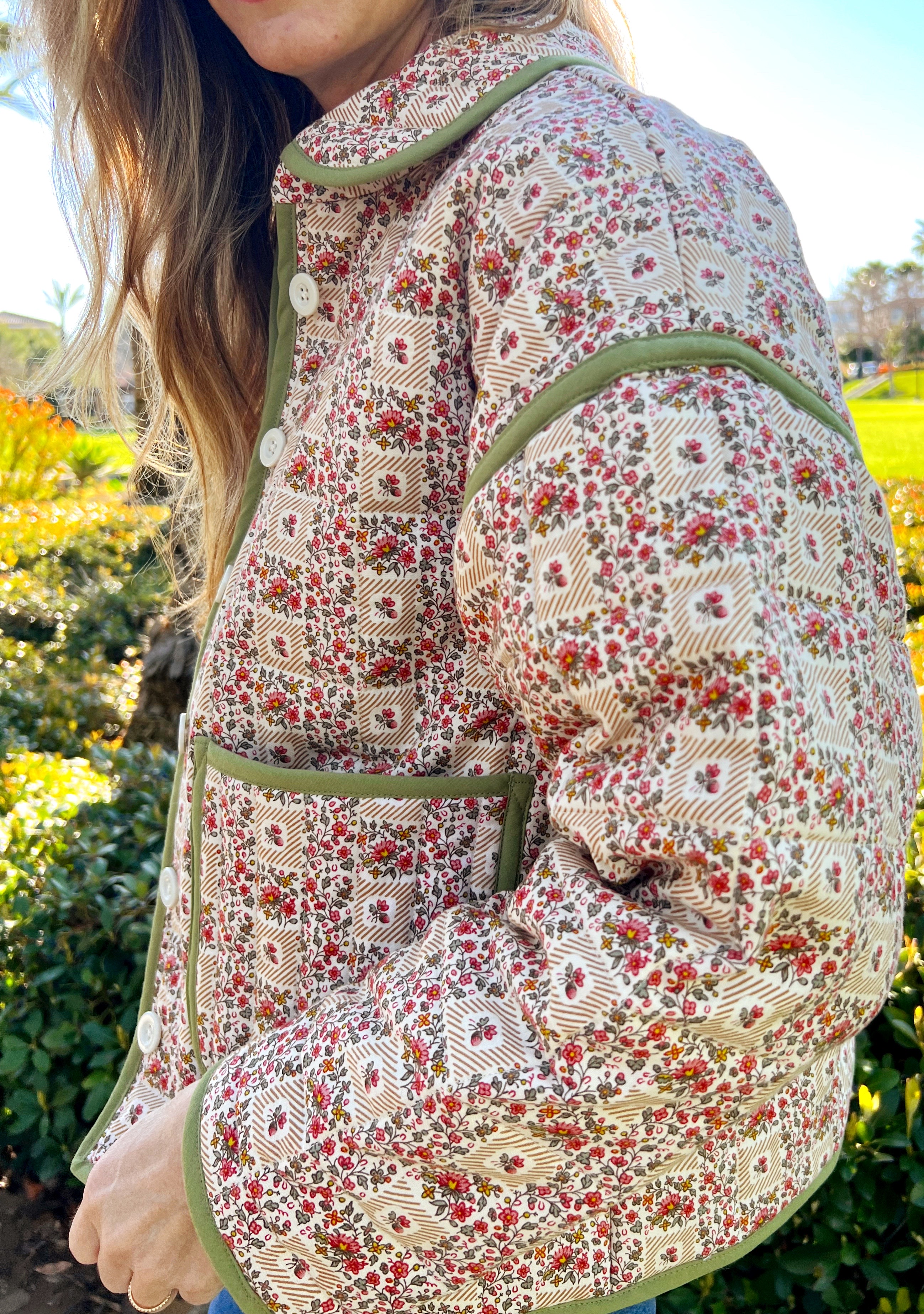 I found the Nerrisa Quilted jacket by By Hand London, and knew we were in business. Now for the fabric… I really loved the free people jacket in florals so I set out to find a floral cotton fabric that caught my eye. I finally came across this really pretty small almost liberty like floral in nuetrals but also a little color. It was perfect. I also liked that I could play with contrasting bias binding matching the olive green. Even better, it was only $7 a yard. I found it at Stone Mountain Daughters online fabric shop. Next, I hit up Joann to grab a lining cotton, I chose a tan color cotton similar to the little tan stripe in the main fabric’s design. I also grabbed tan and green bias tape. Tan for the inside finishes and green for the outside finishes. I also grabbed three different thread colors: cream for the outside of the jacket, tan for the inside and green for the bias finishes. I also picked up some high loft polyfil batting, and cream buttons.