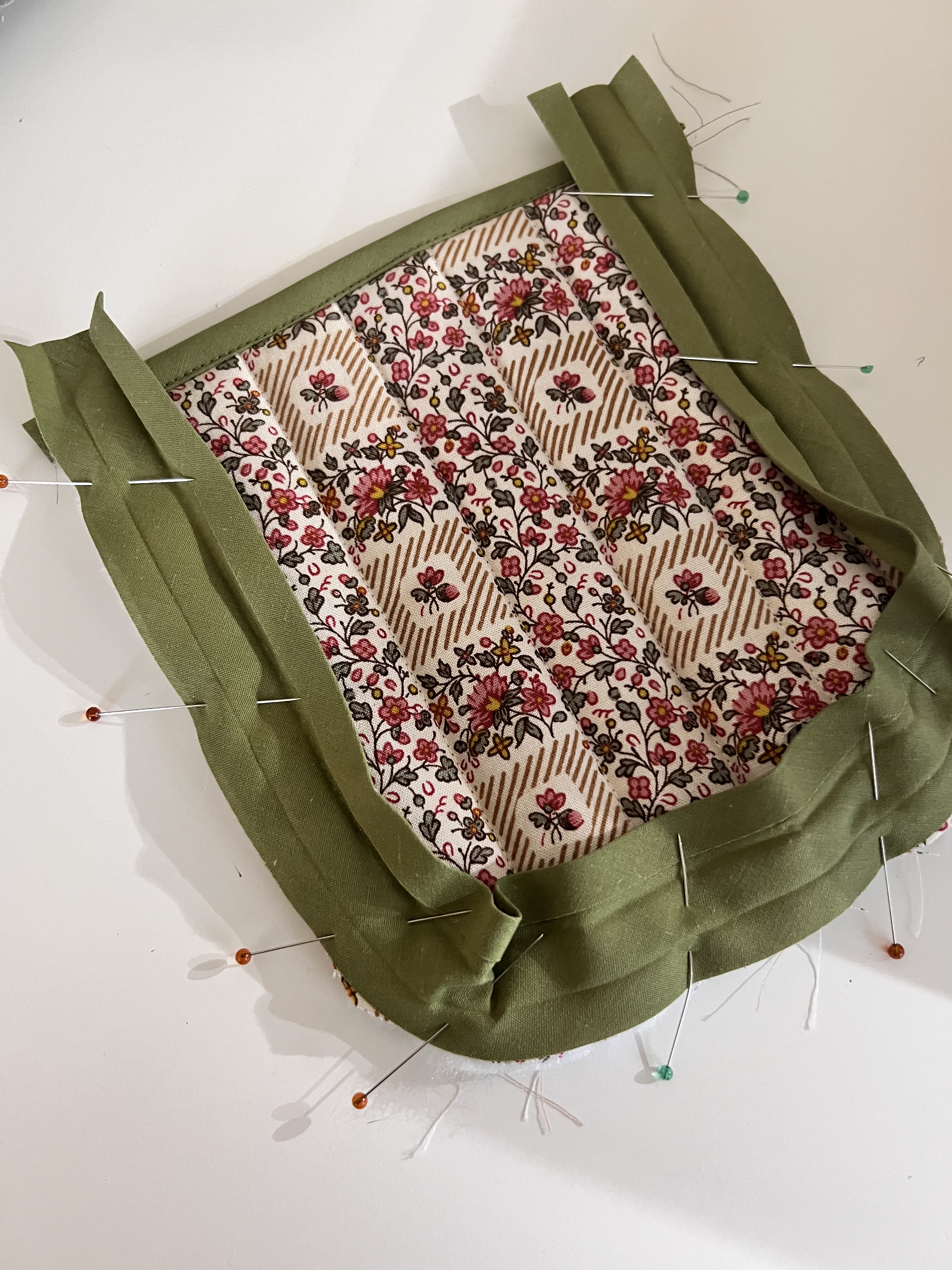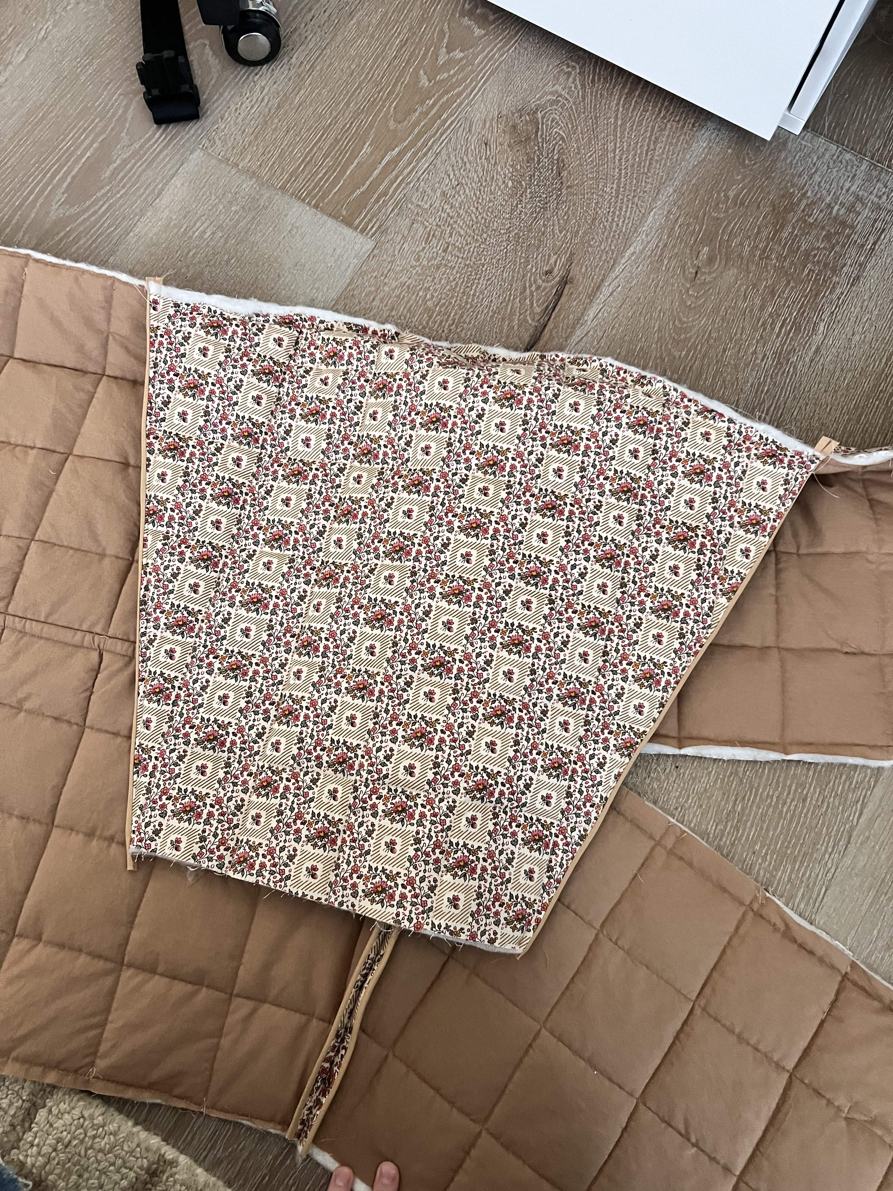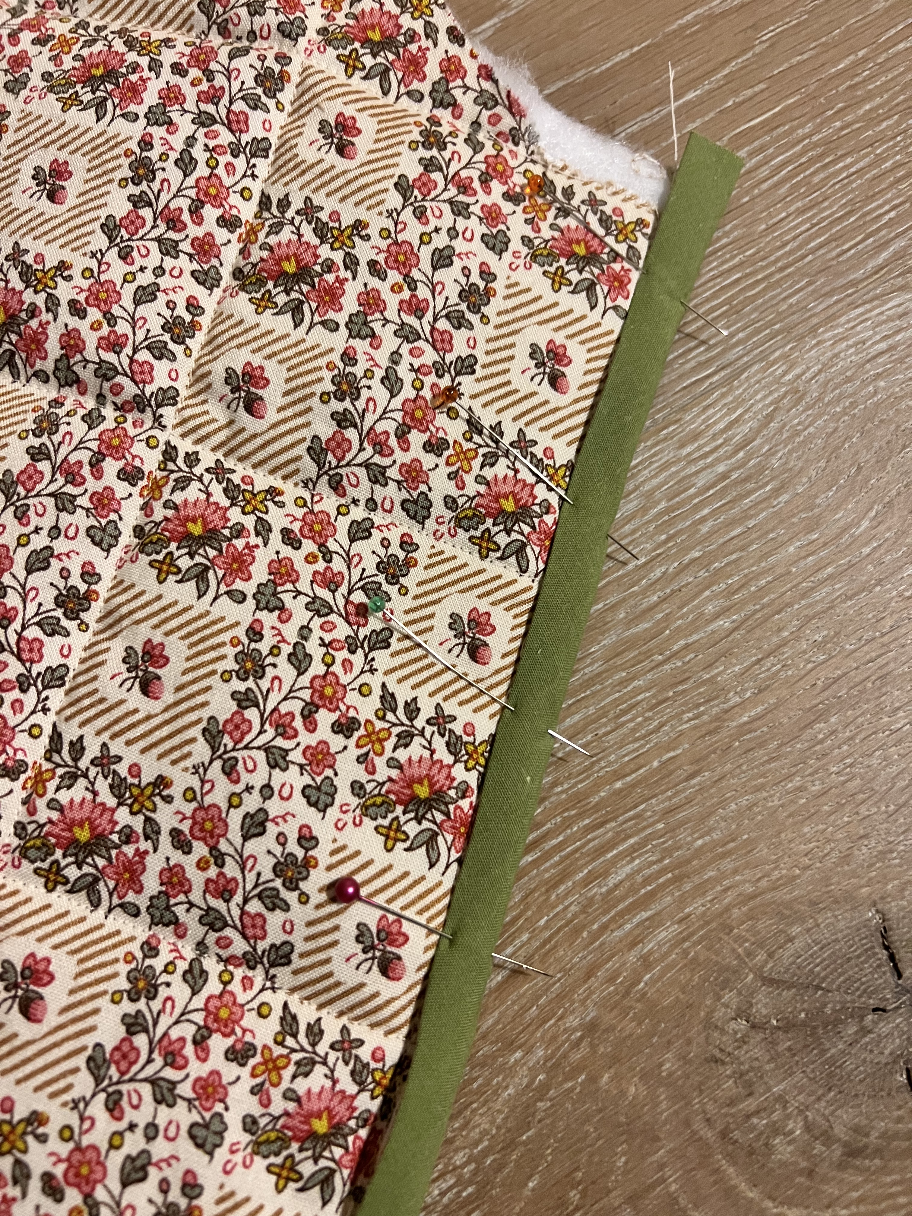 I found the Nerrisa Quilted jacket by By Hand London, and knew we were in business. Now for the fabric… I really loved the free people jacket in florals so I set out to find a floral cotton fabric that caught my eye. I finally came across this really pretty small almost liberty like floral in nuetrals but also a little color. It was perfect. I also liked that I could play with contrasting bias binding matching the olive green. Even better, it was only $7 a yard. I found it at Stone Mountain Daughters online fabric shop. Next, I hit up Joann to grab a lining cotton, I chose a tan color cotton similar to the little tan stripe in the main fabric’s design. I also grabbed tan and green bias tape. Tan for the inside finishes and green for the outside finishes. I also grabbed three different thread colors: cream for the outside of the jacket, tan for the inside and green for the bias finishes. I also picked up some high loft polyfil batting, and cream buttons.
