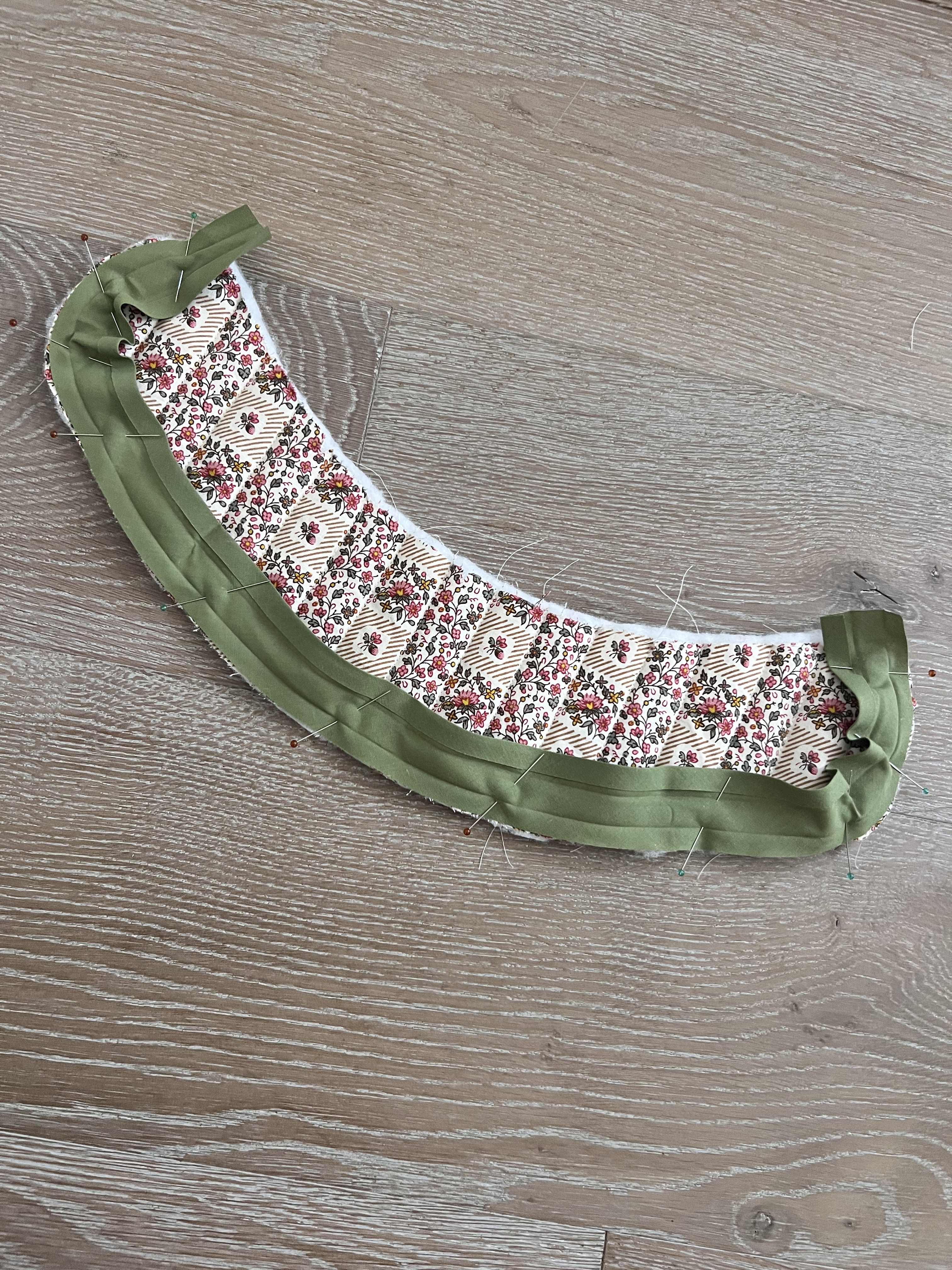 Apply the bias tape along the raw outer edge of the quilted collar. Sew in place. Flip it over and edge stitch along the top of the collar, catching the loose edge of bias tape underneath to finish.