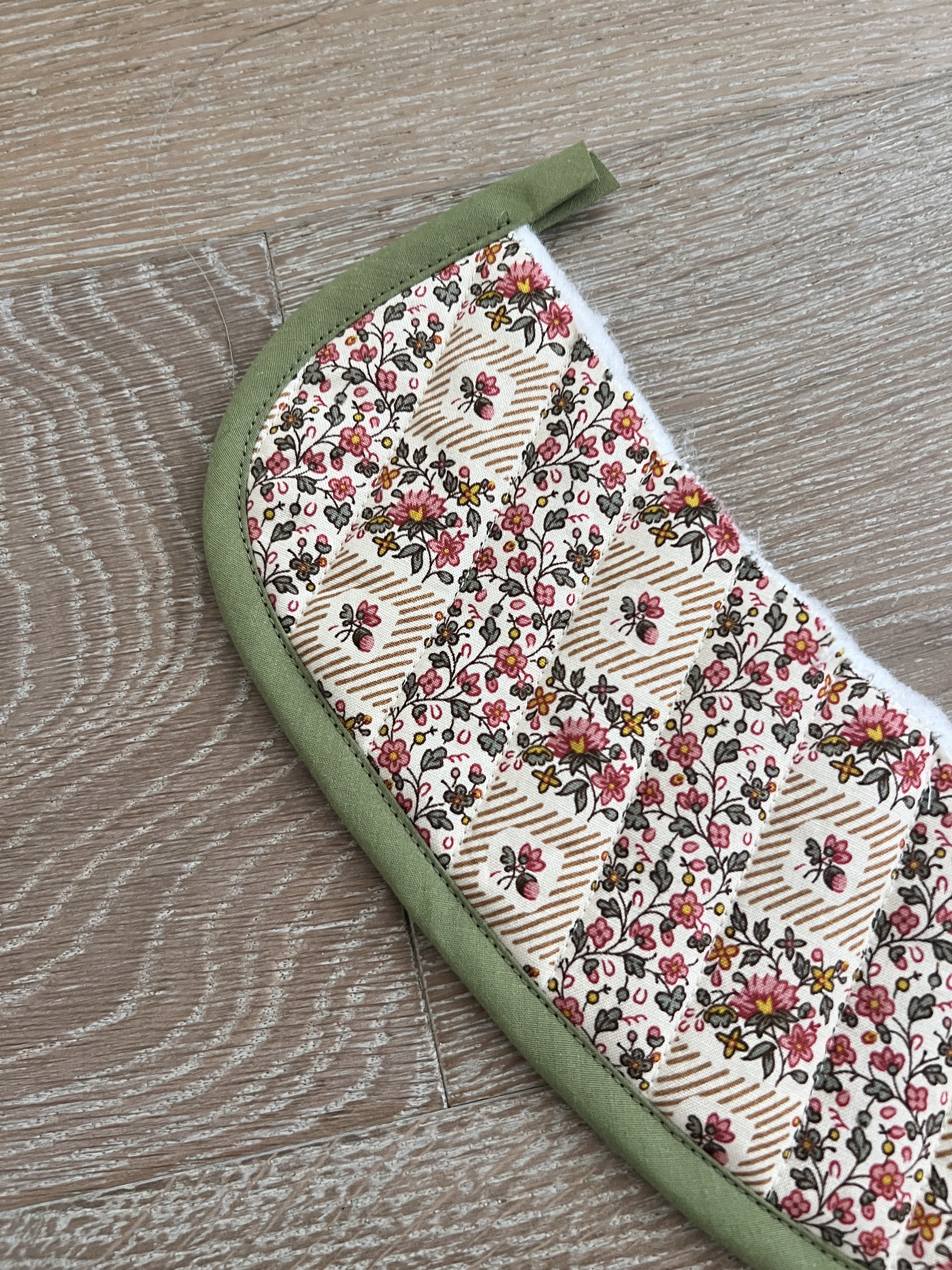 First, quilt the pocket piece just as you did all of the other pieces. You can use a different quilting pattern here if you’d like. Then apply bias tape all around the pocket just like we did in the past steps. You can apply along the top first, and then finish around the sides like I did, or (what I should of done) is use one long piece and miter the top corners. I folded the tape under to finish my top edges. It was late and I wasn’t thinking clearly. I would miter the corners if I were you, it will give you a really nice finish. You can Youtube how to miter bias binding. Either way is acceptable. 🙂