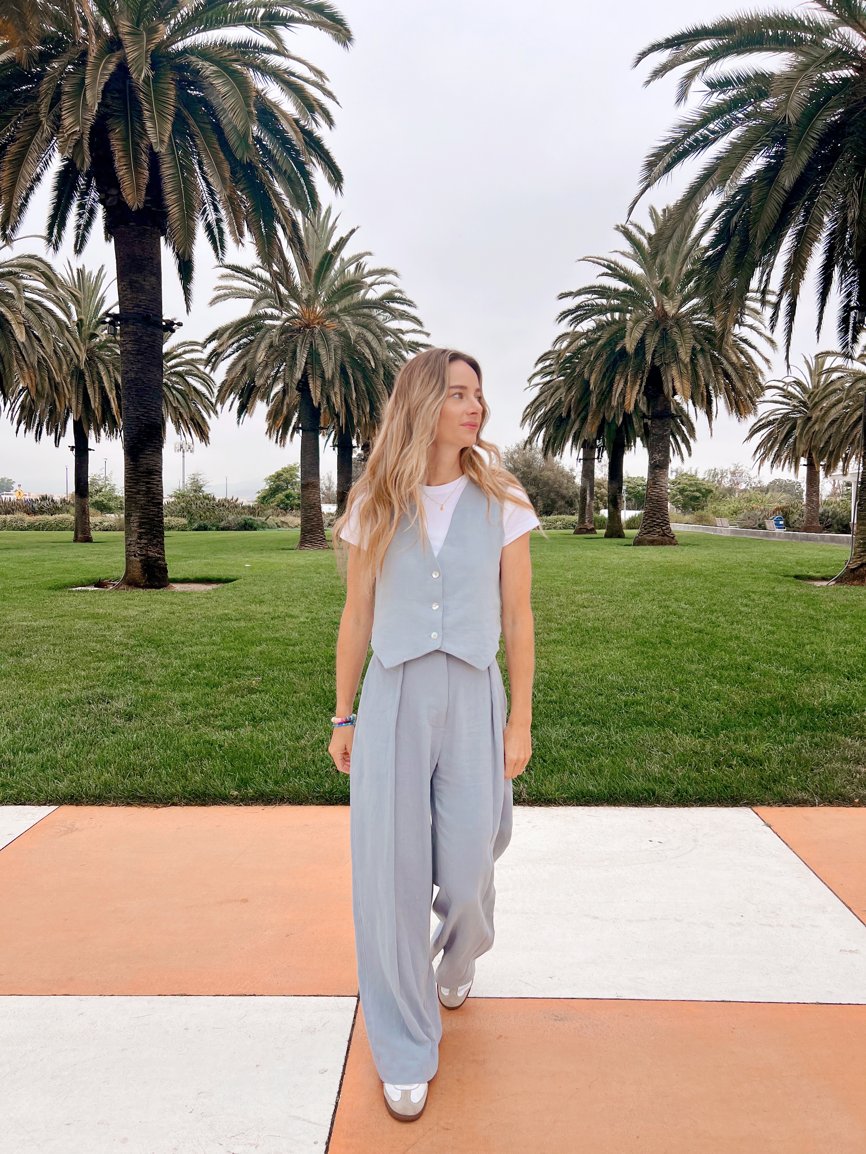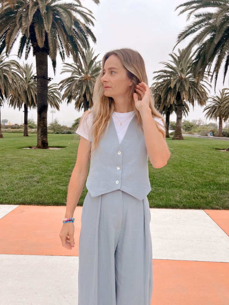 Now, for the vest. Linen vests are a really big trend right now. I love the idea of being able to pair it with a matching trouser but also on it’s own with jeans or a skirt. For the vest pattern I went with the Pipit Vest by Common Stitch. It’s often paired with the Protea Pants by many sewists so this is nothing new here. This vest is also very well done. It’s just two pattern pieces and comes together very quickly. The instructions were very clear and easy to follow. I sewed up a size 6, and it fits really cute. I chose to use mother of pearl buttons as they another big trend for spring/summer and they paired nicely with the dusty blue color of my fabric.