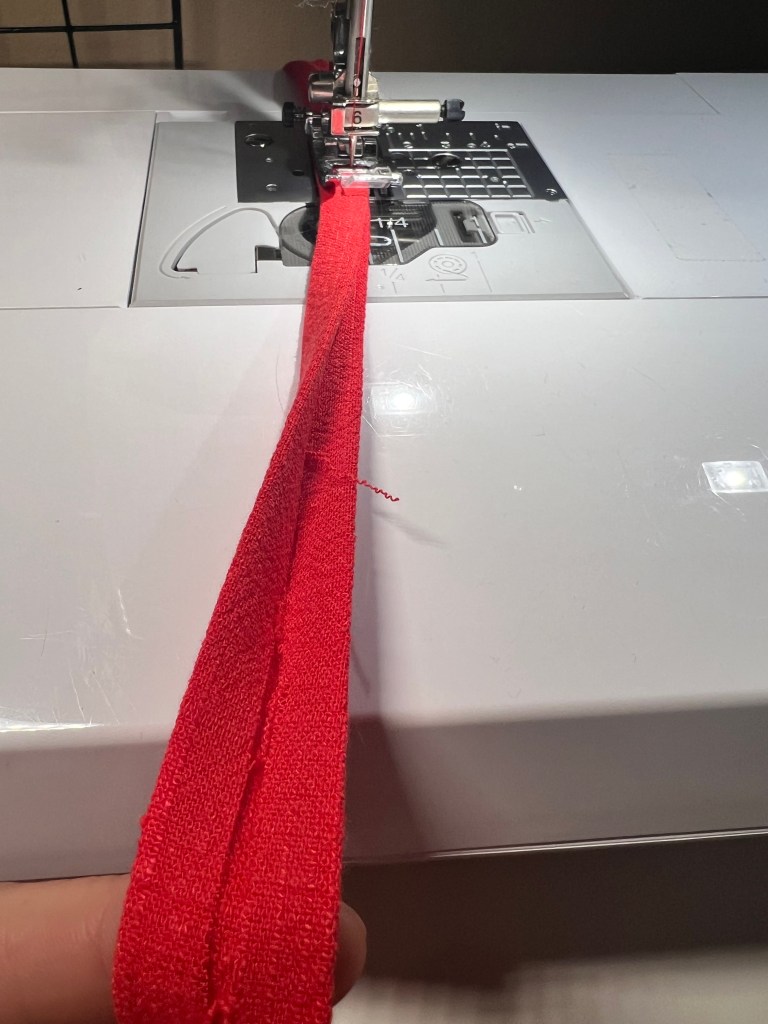 Step 1: Prep tie pieces. Fold tie in half wrong sides together. Unfold and fold raw edges in again at the crease we just made. Fold one long edge in by 1/2″. Fold tie together and edge stitch to finish.