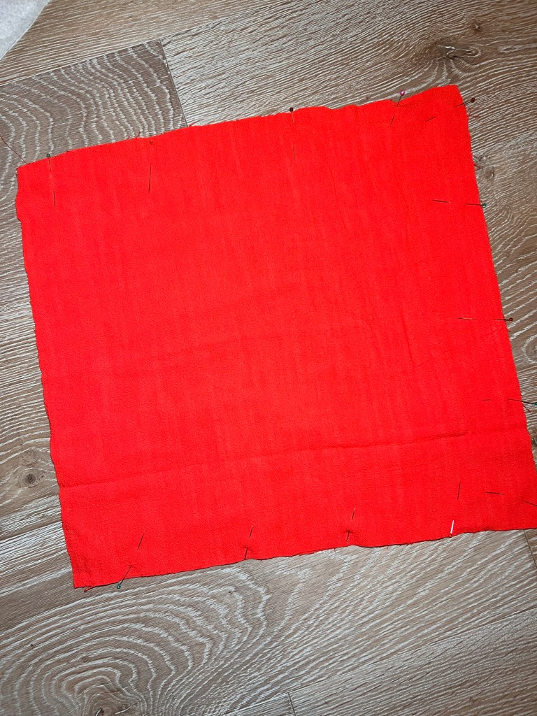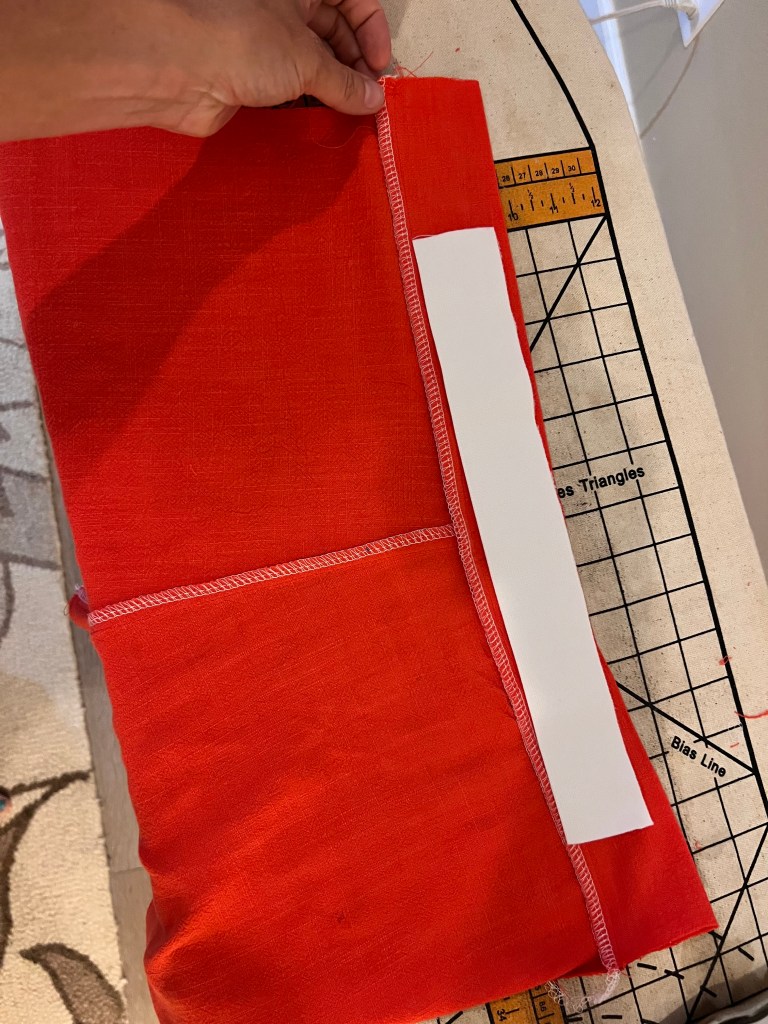 Step 3: Lay the other skirt panel on top, right sides together. Pin along three edges: the top edge, right side seam edge and bottom hemline edge. The left edge will not be sewn at this time. Sew around the three sides at 1/2″, pivoting around corners. Trim the corners and flip right side out. Press well.