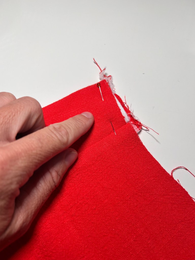 Step 2: Prepare the front skirt panel. First, pin one tie by the raw edge at the top right corner of one skort panel (looking at the skirt panel) 1/2″ down from the top edge. Baste in place.