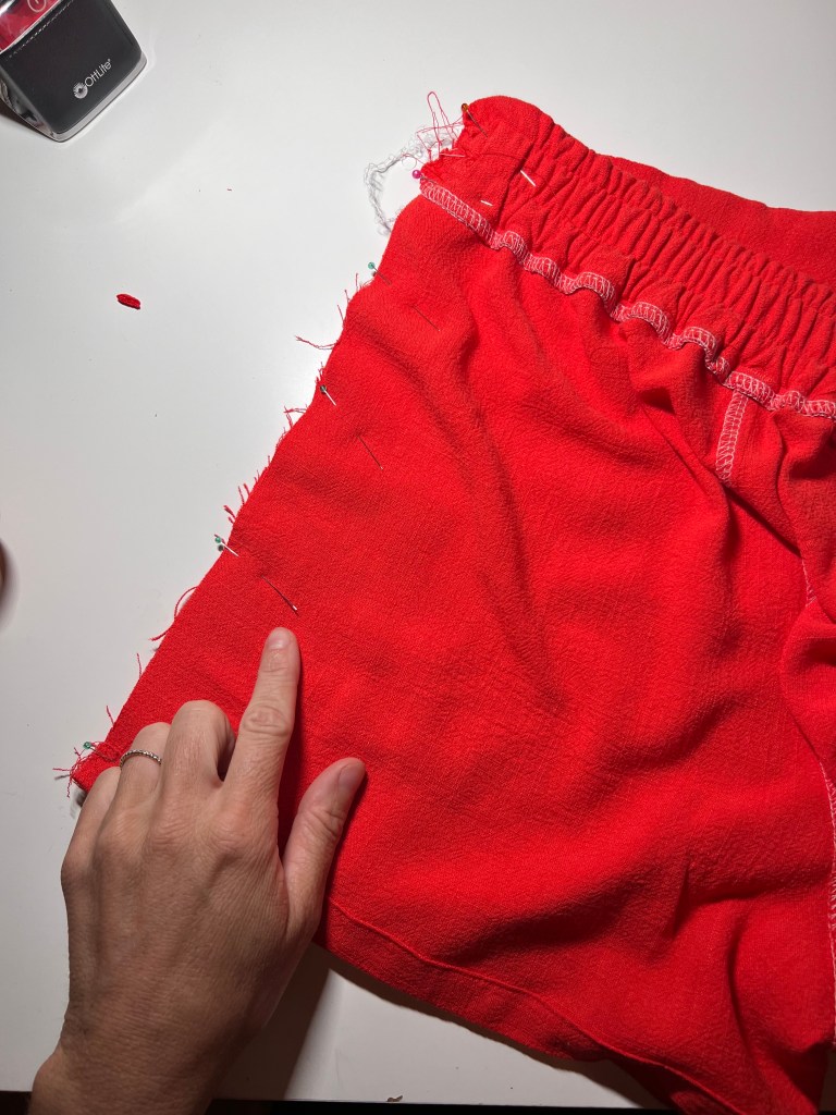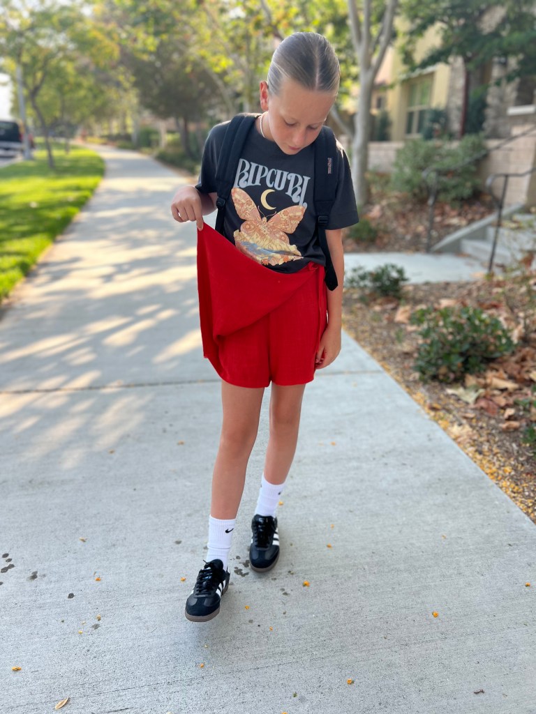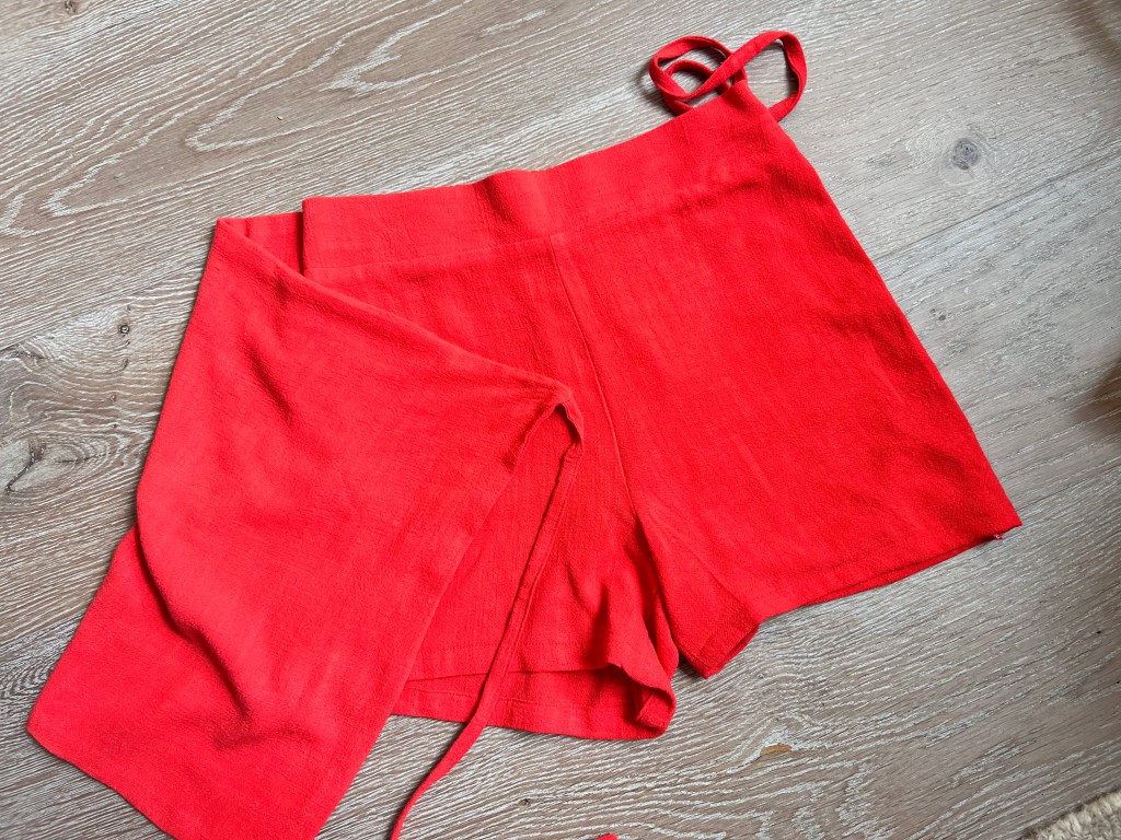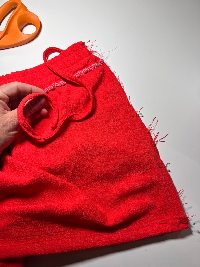 I realized we could just make our own and base it off a kids shorts pattern. We used the Paper Cut Pattern Kids Tula Pants pattern. The fabric is called Red Rush Viscose Linen from Matchy Matchy Sewing Club. We love how it turned out! It was a super quick sew, we made the whole thing in under two hours. (That’s with my daughter sewing some seams and documenting along the way for this post).