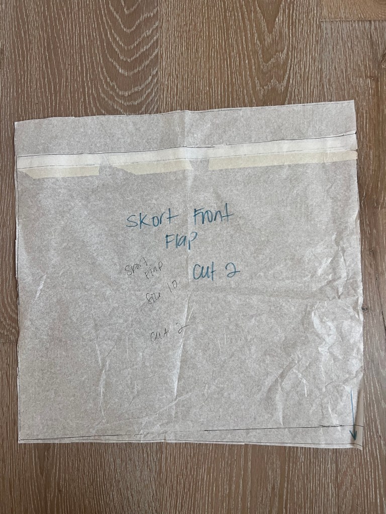 For the front skirt flap, we created the pattern to be 15″ wide x the same length of the shorts + the length of the new front waistband we created, minus the seam allowance. We added 3/4″ of length at the bottom right corner and we drew the bottom hemline from this mark so it would hang slightly longer on one front corner. You will cut out two of these, or one pair.