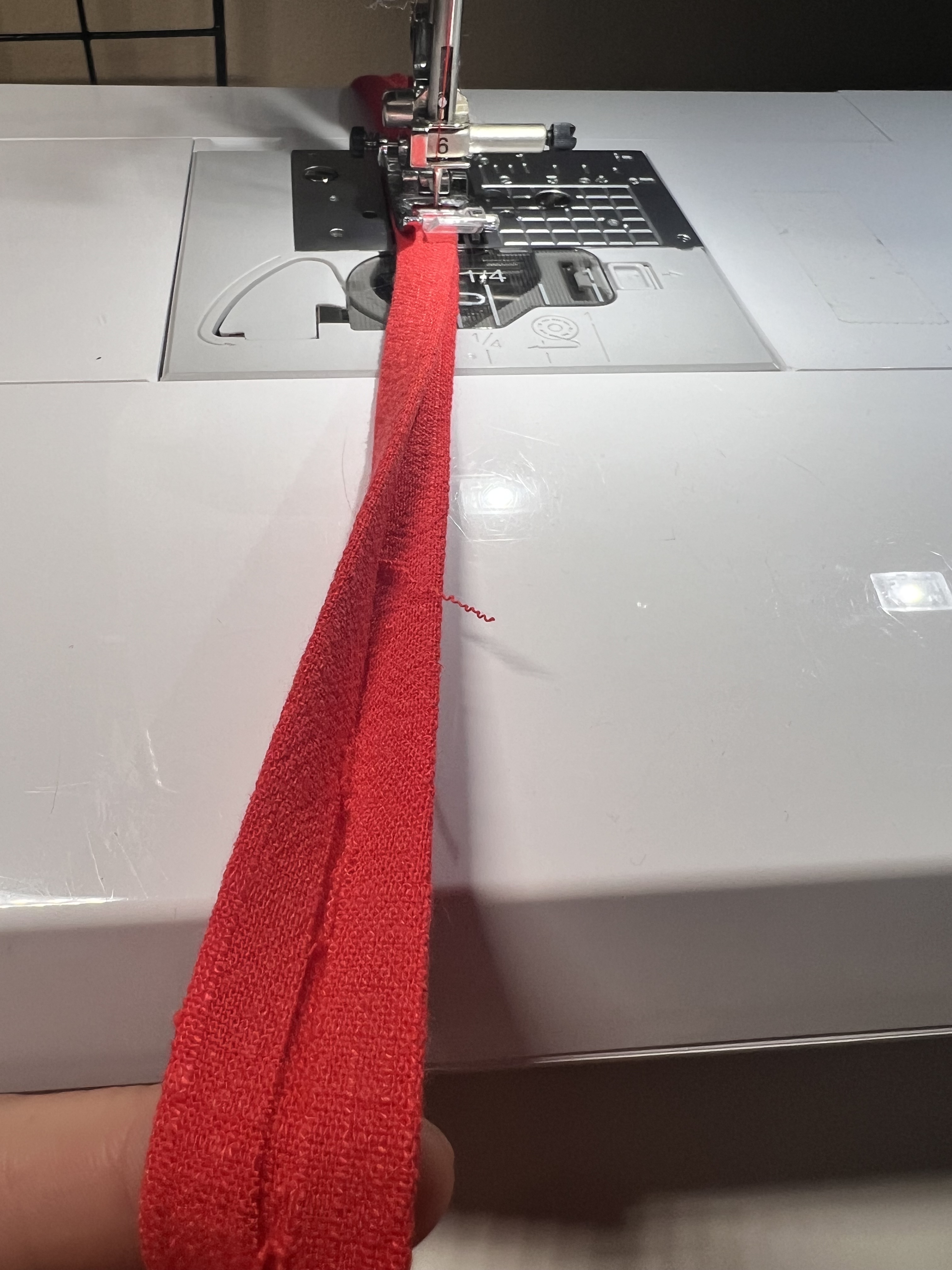 Step 1: Prep tie pieces. Fold tie in half wrong sides together. Unfold and fold raw edges in again at the crease we just made. Fold one long edge in by 1/2″. Fold tie together and edge stitch to finish.