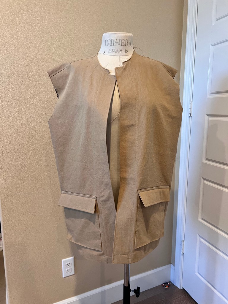 6. At this point, try on the jacket and decide how long you want the sleeve to be. I ended up trimming off a little more length from my sleeves. Keep in mind the length of the cuff you will be adding.