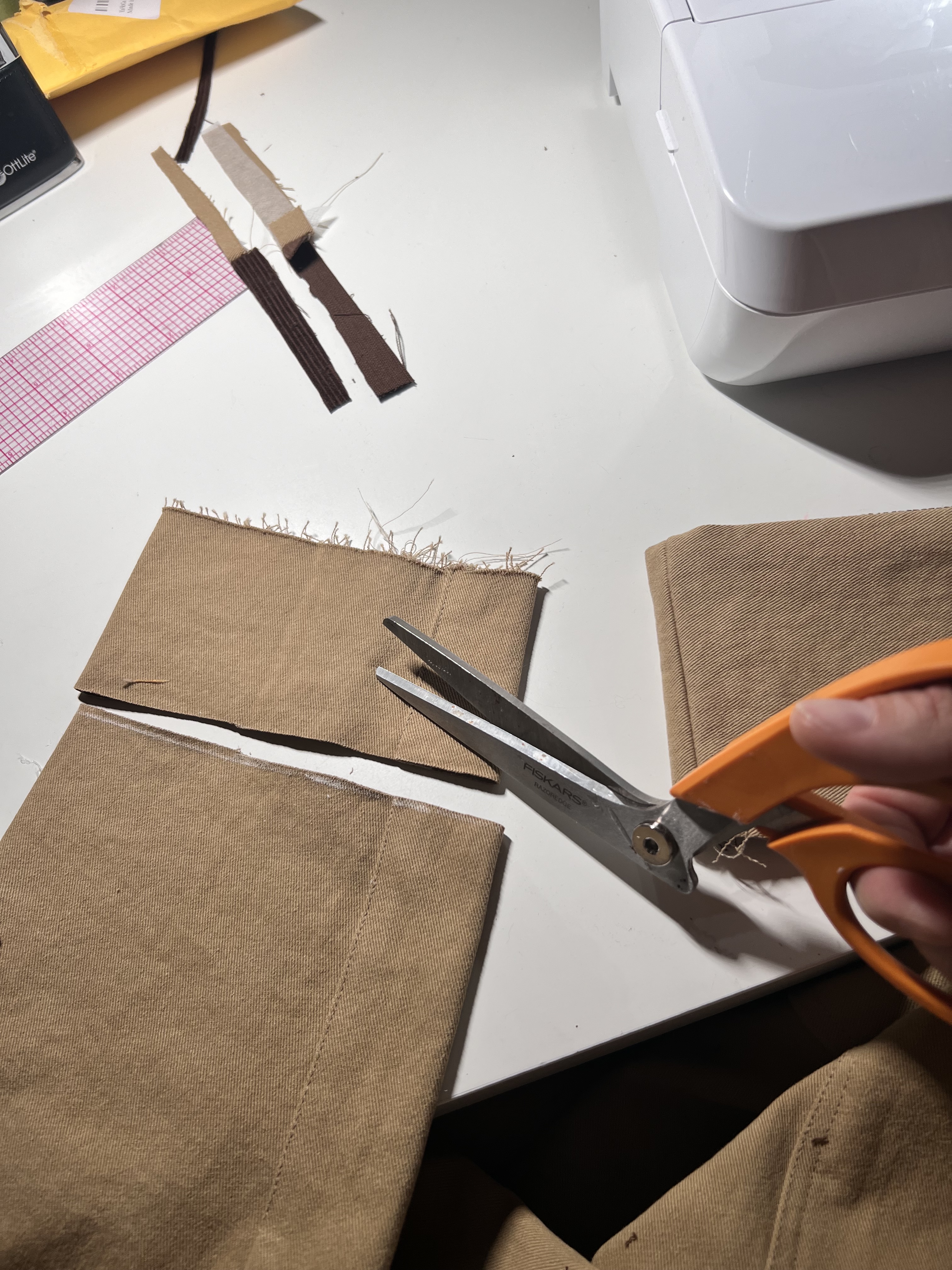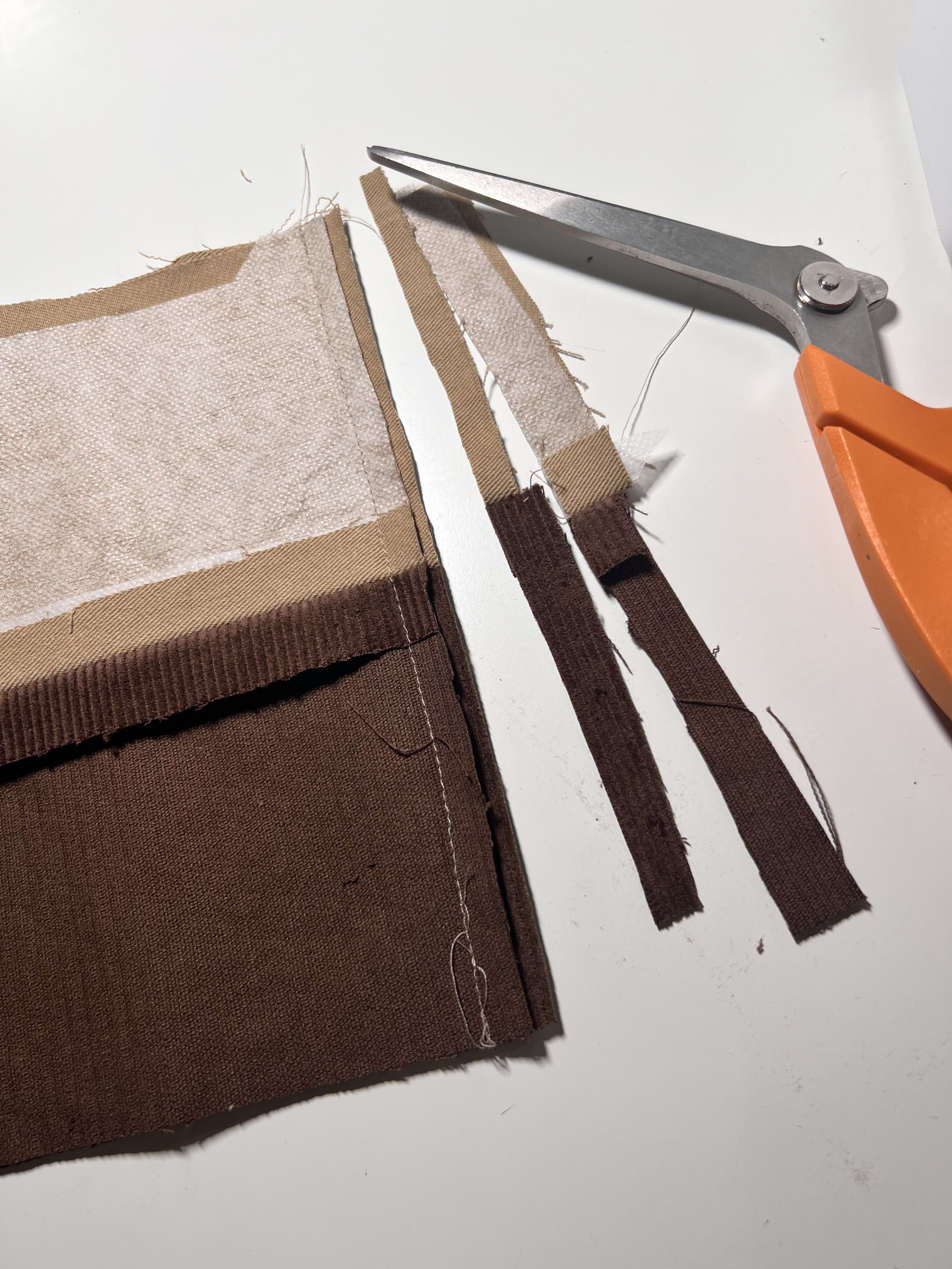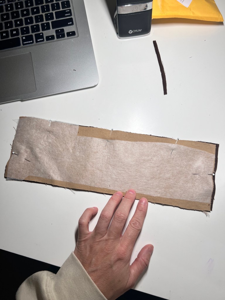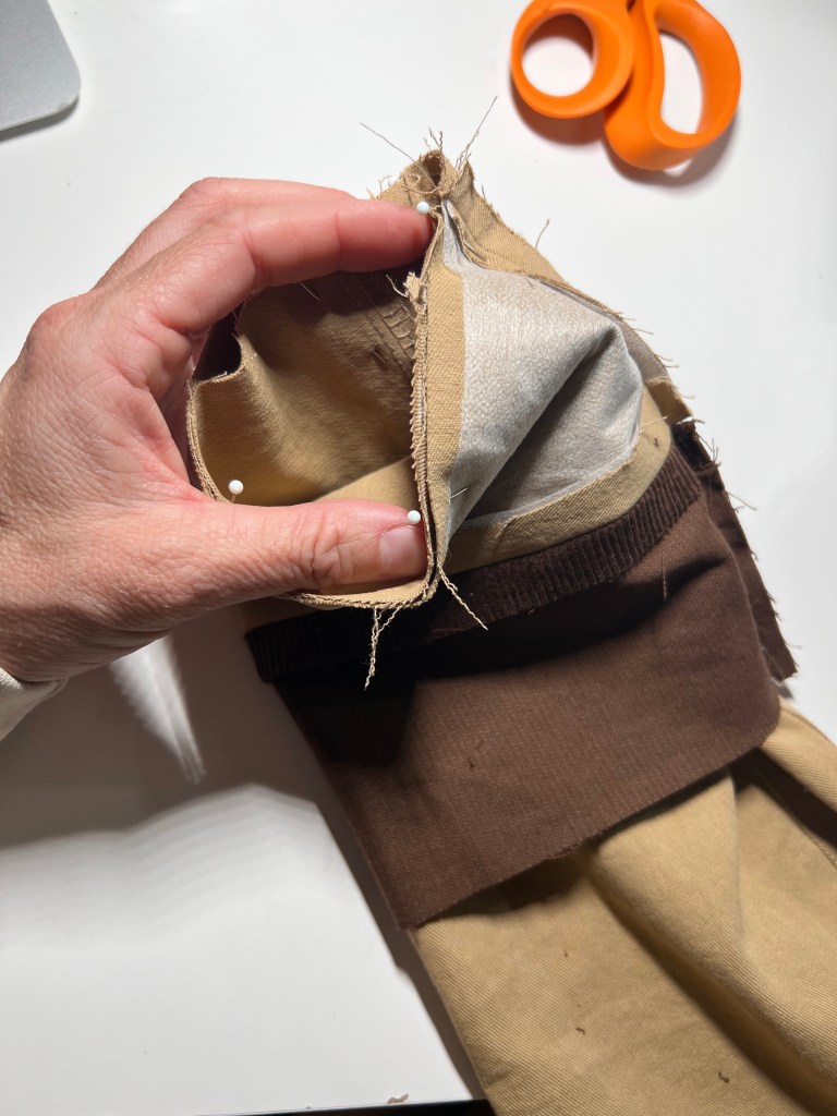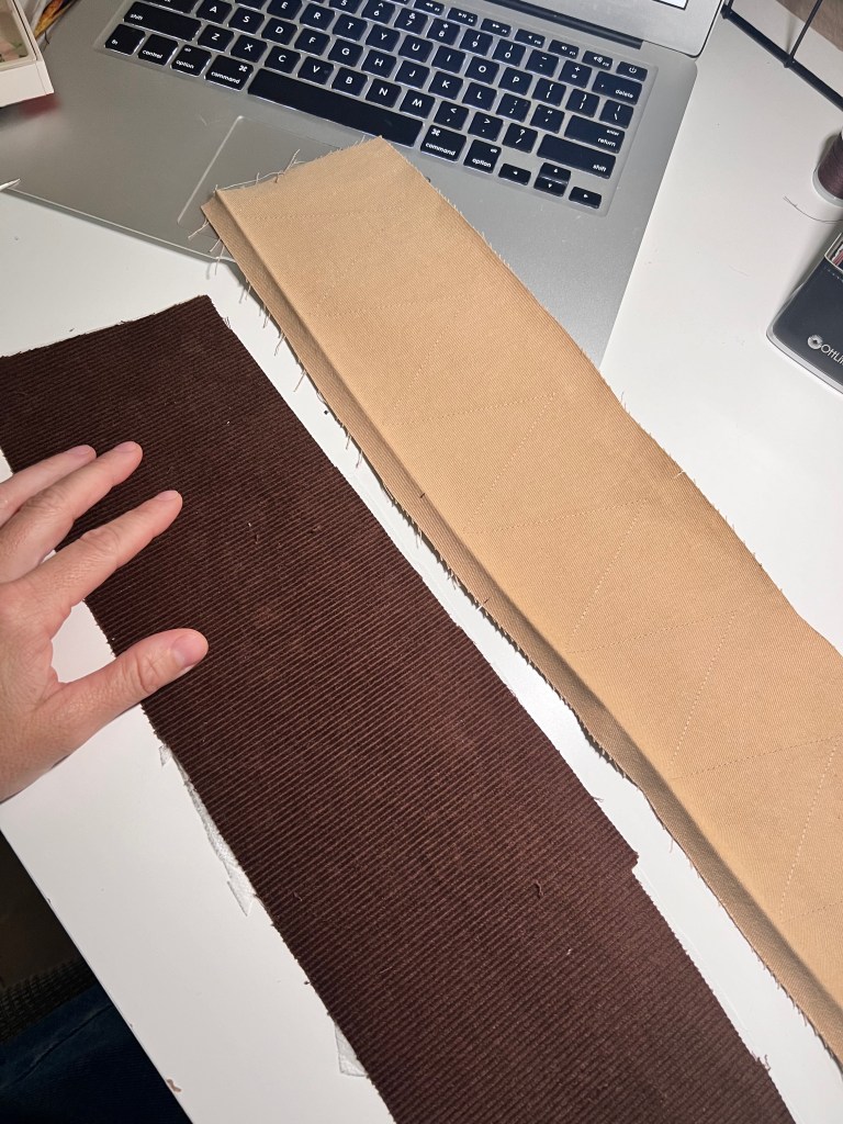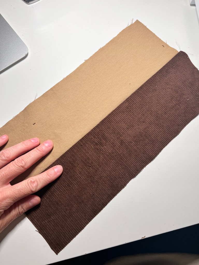 3. Next, interface the two twill cuff pieces. Now, lay one twill and one corduroy cuff right sides together. Pin along one top long edge and sew using a 1/2″ seam allowance.
