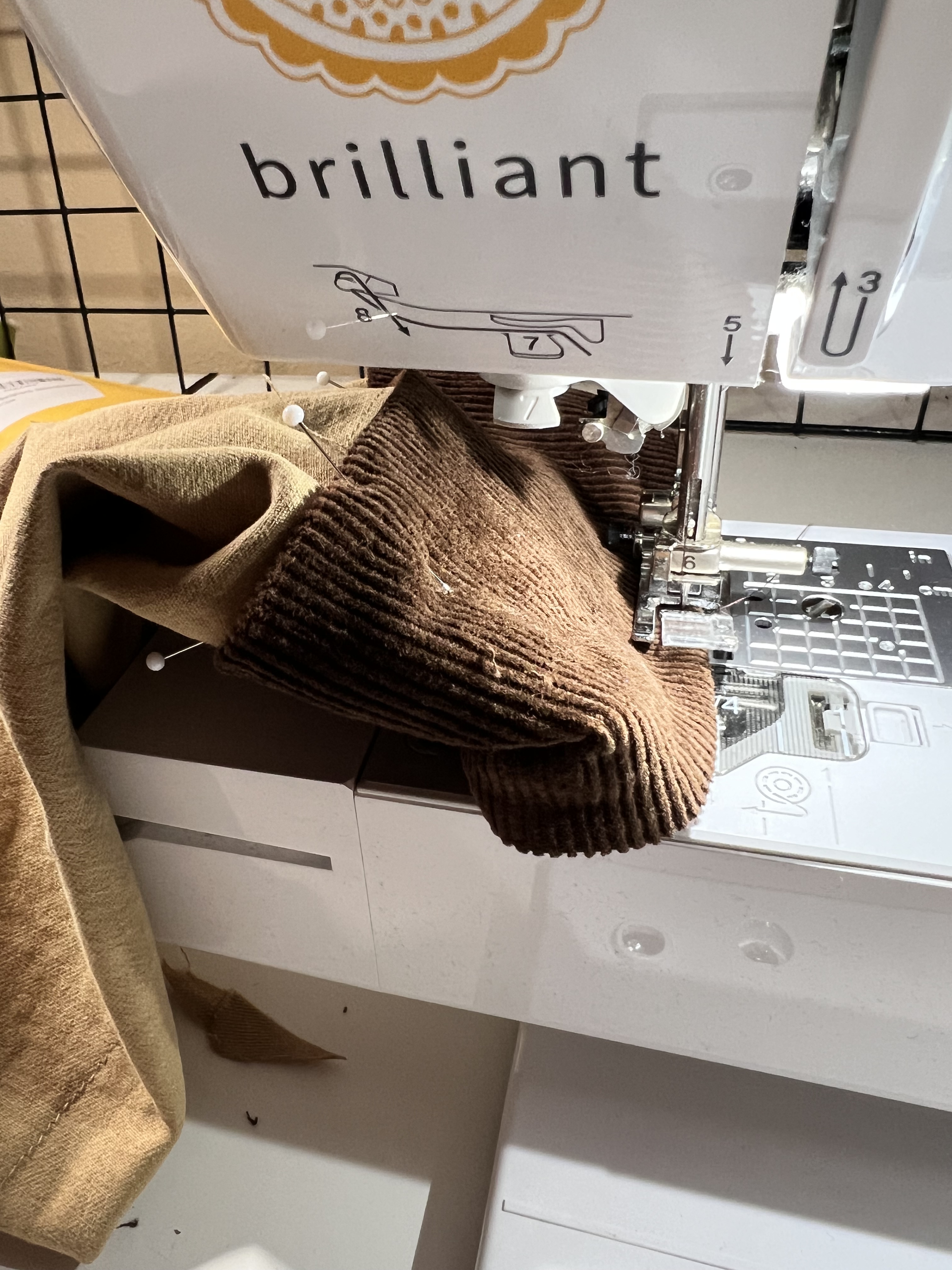 7. Next, pin the right side of the twill side of the cuff to the right side of the sleeve. Sew in place.