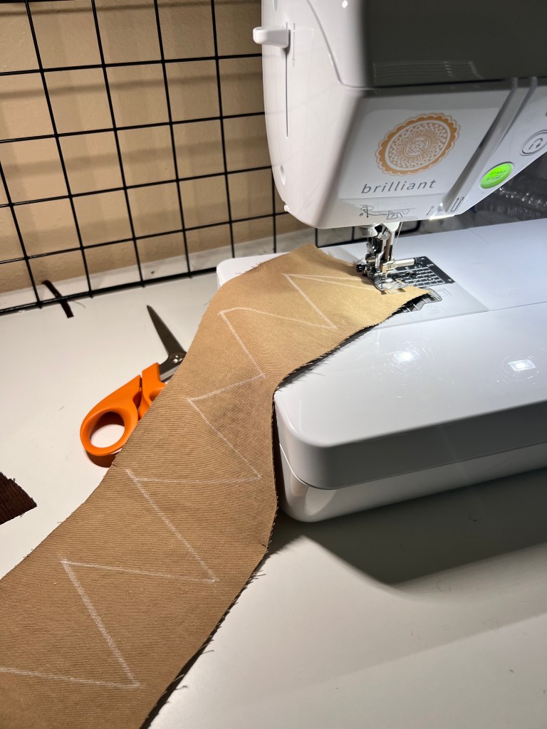 9. Next, edge-stitch along the cuff edge. Make sure to use dark brown thread on top and light brown thread in the bobbin for a nice finish. Then using a slip stitch method, finish the cuff edge by hand sewing it in place, hiding the seam-line as you go. I couldn’t fit the sleeve under my sewing machine at this point, even taking the tray out. So I just finished it by hand. Give everything a good press and you’re all finished!