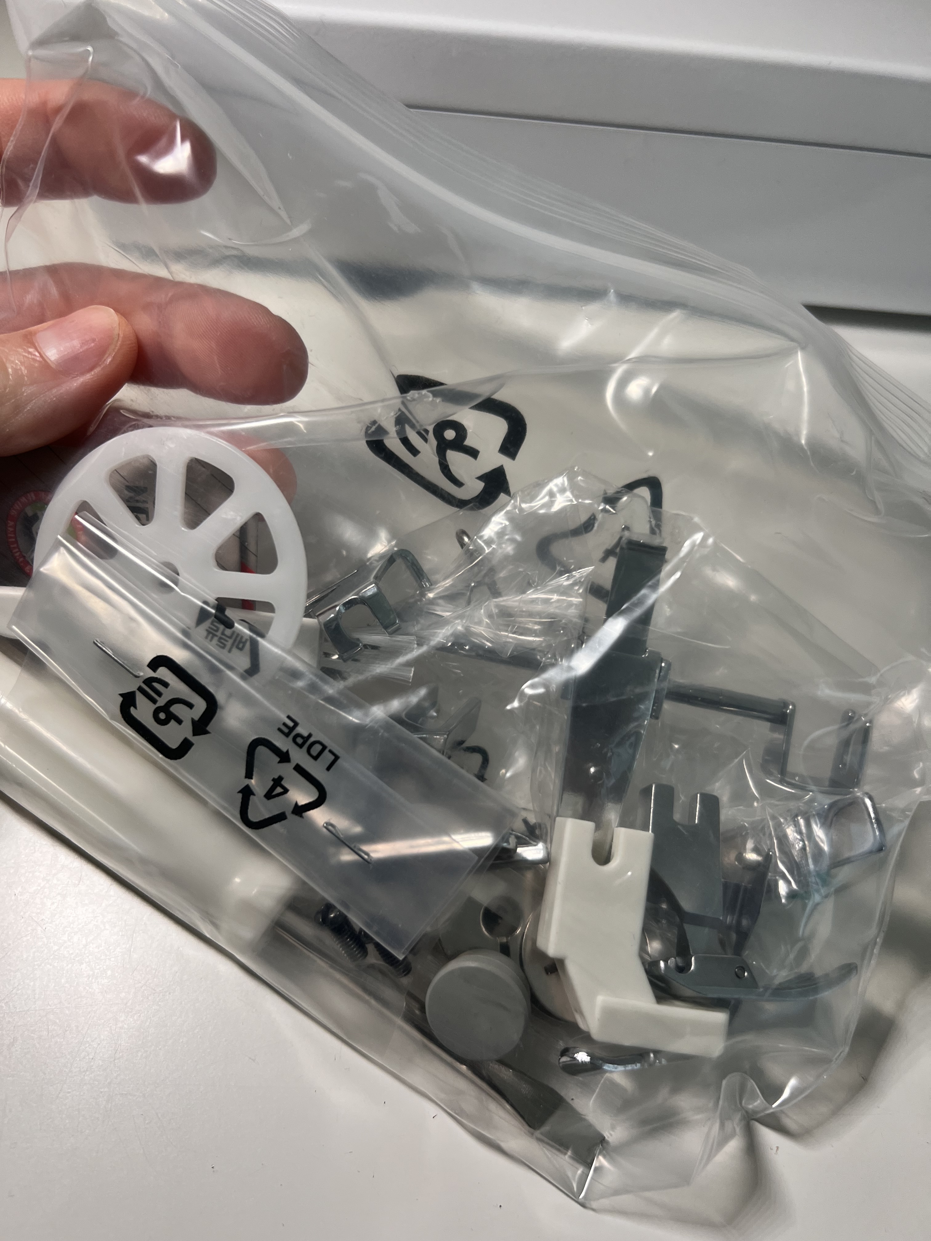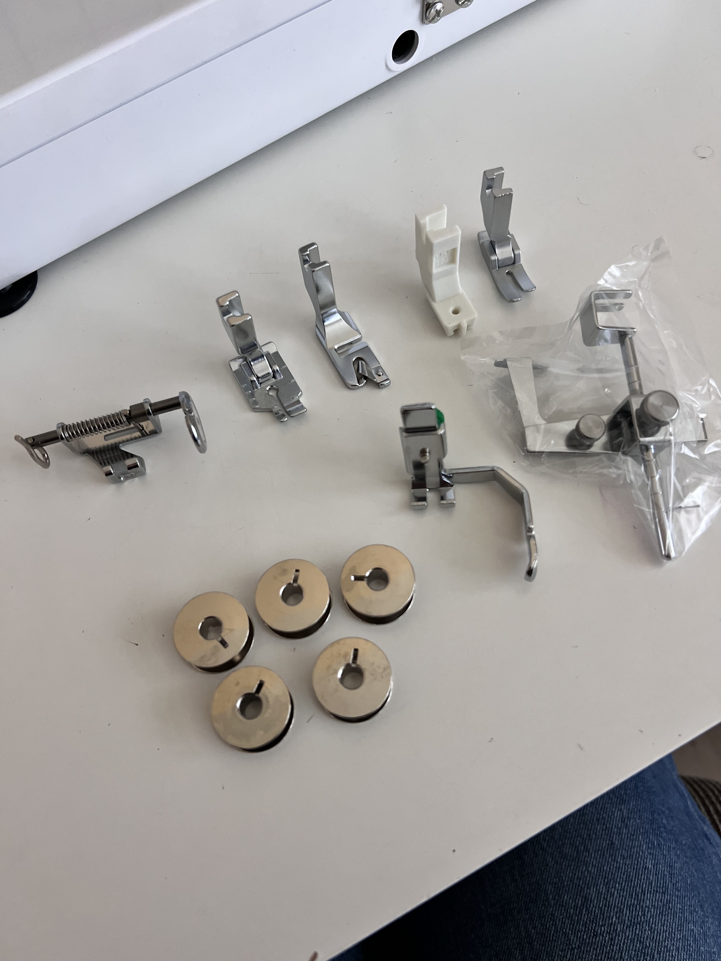 It comes with 7 feet: Flex-reaction, Free-motion quilting, General purpose, Invisible zipper, Rolled hem, Zipper. I so excited to play with all these different feet options.