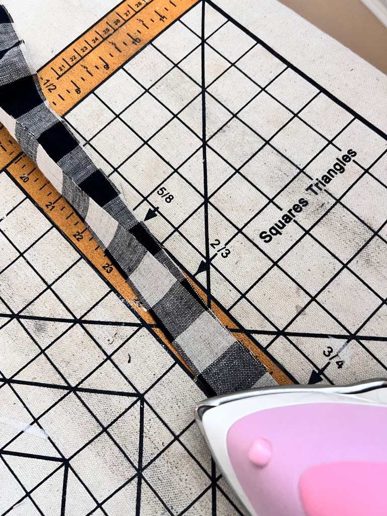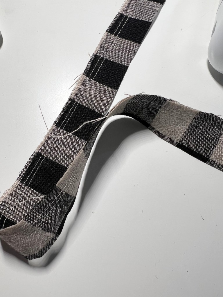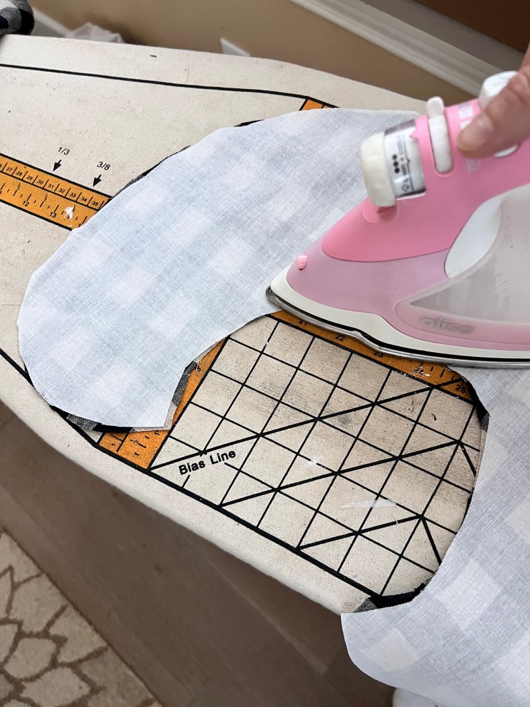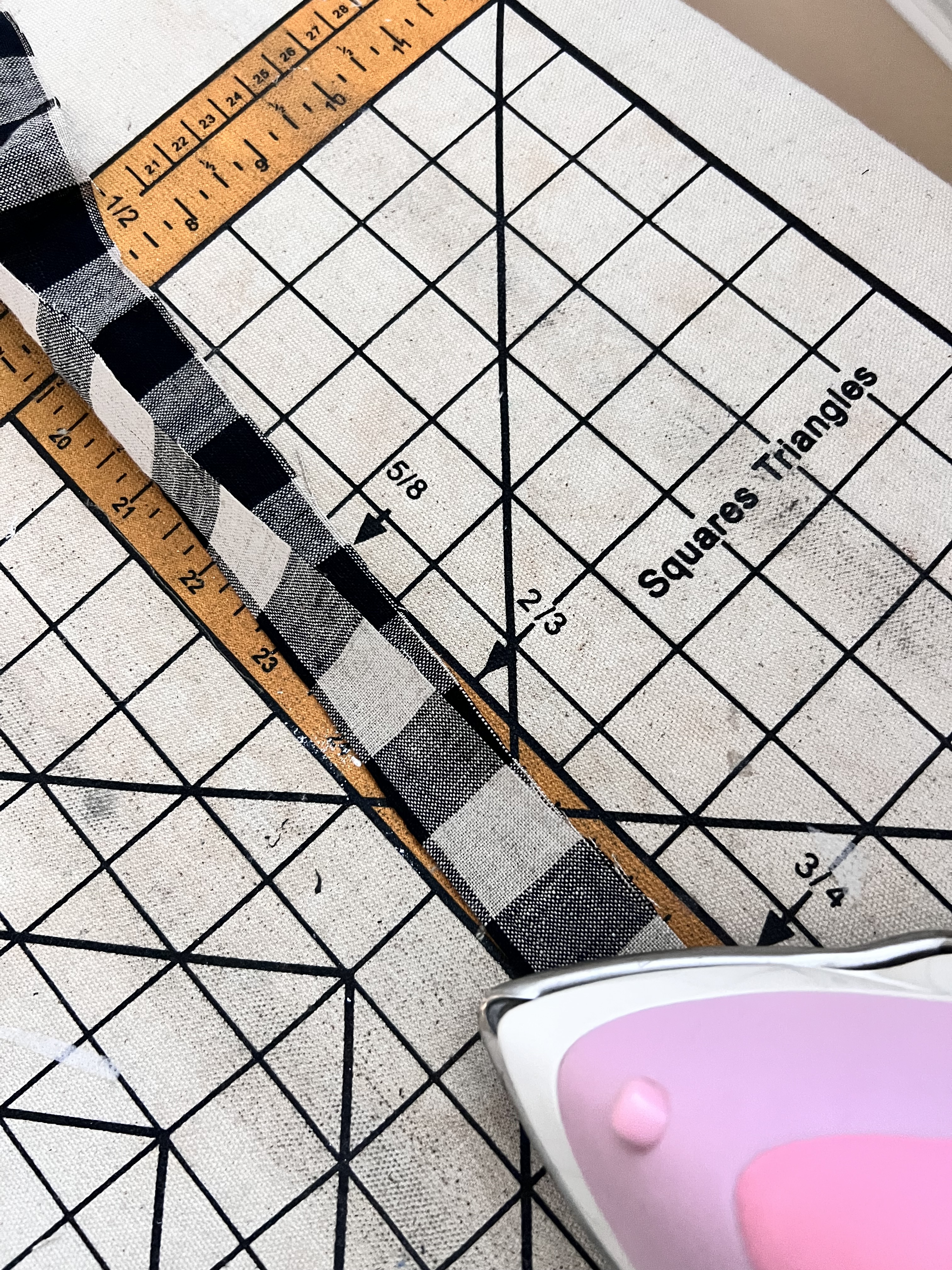 Fold/press the raw edge in at 1/2″, press and pin in place.