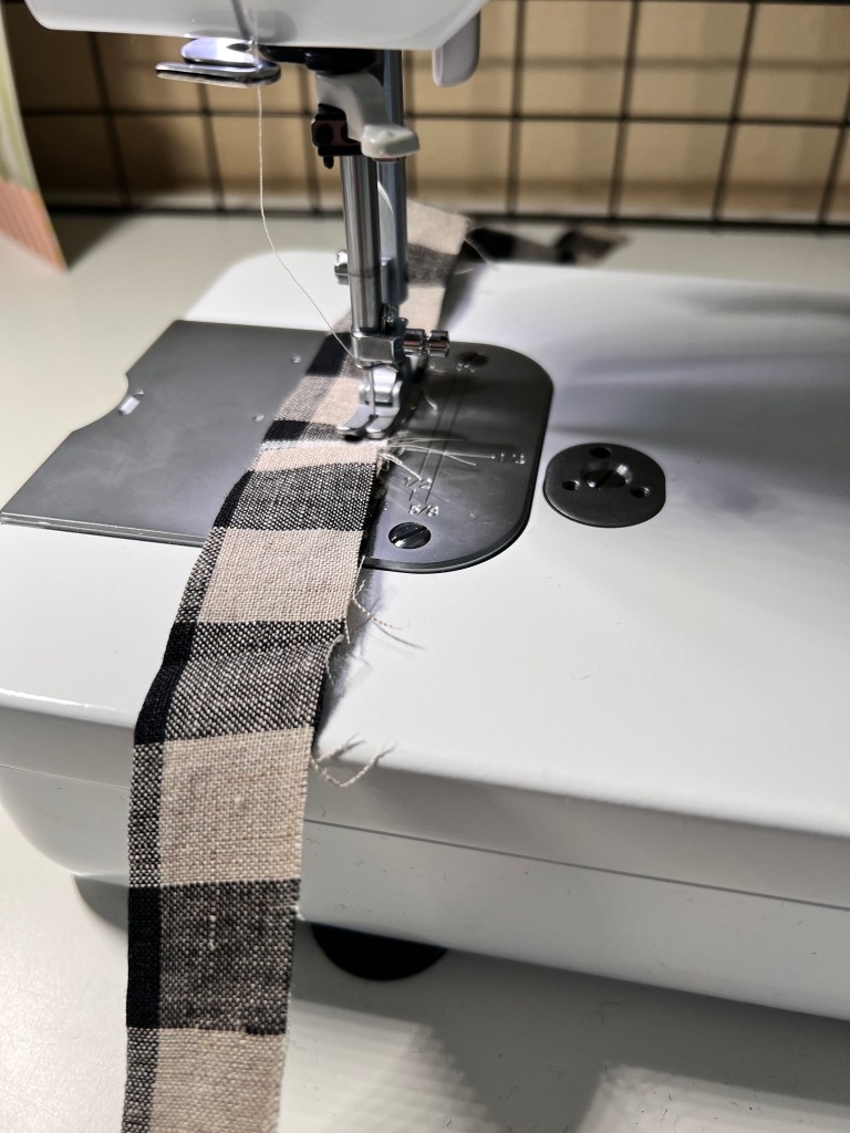 Next, press the trim in half wrong sides together. Now, sew two rows of basting stitches (lengthen your stitch length to 4.0mm) along the raw edges at 1/4″ and 1/2″.