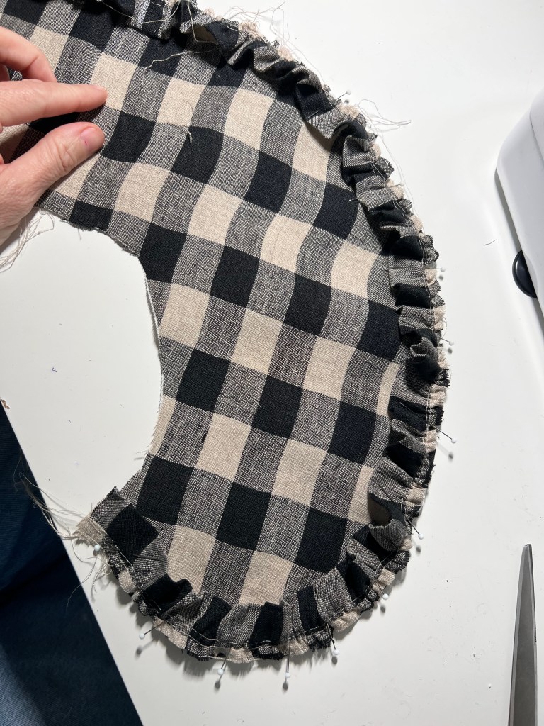 Now, we will sandwich the trim between the two collar pieces. pinning to the right side of the interfaced collar, raw edges aligned, pin the trim at the ends and center to the ends of the collar and center back of the collar to help better evenly distribute the gathers. Gently pull the basting stitches to fit the trim in place. Pin.