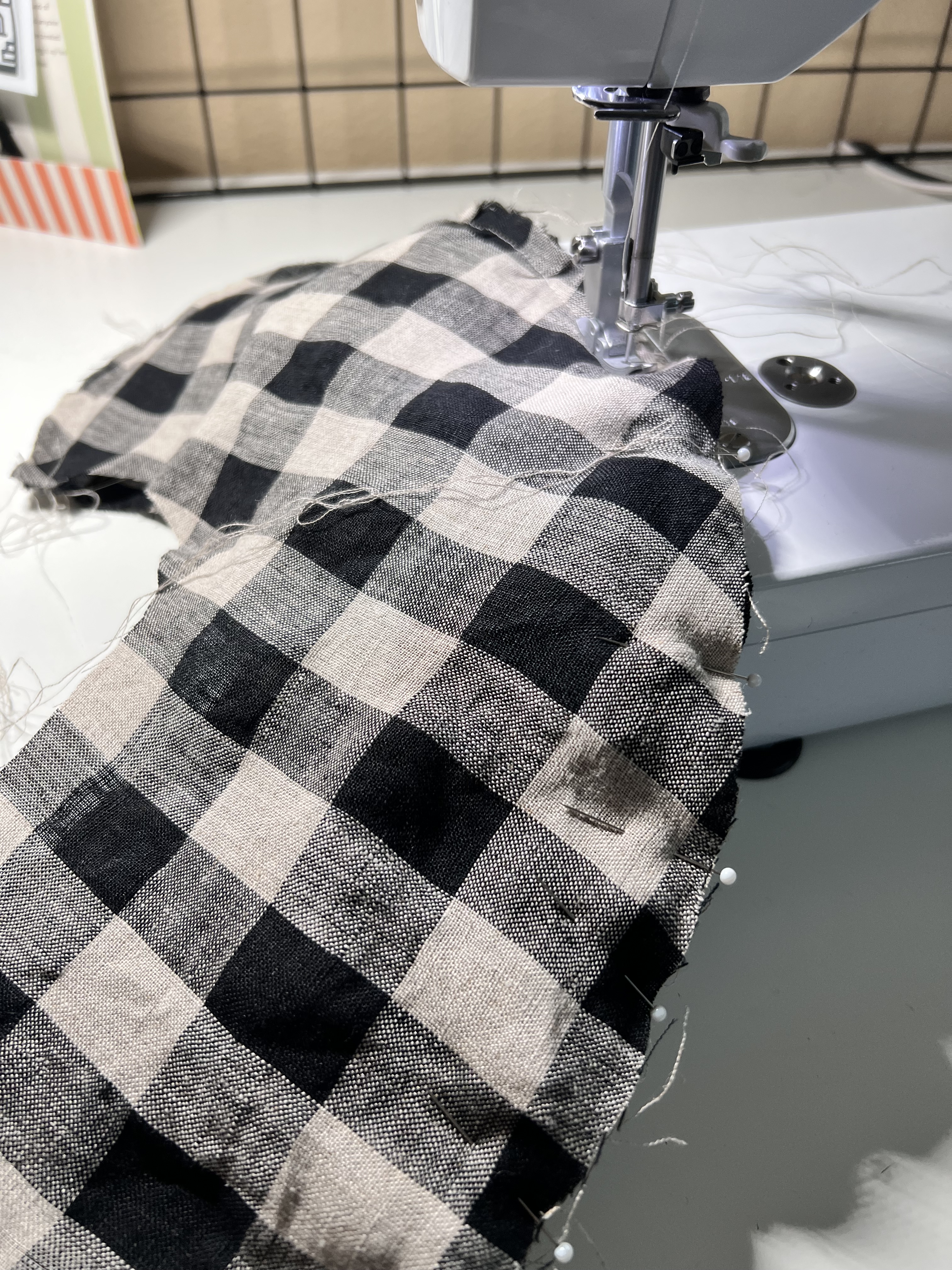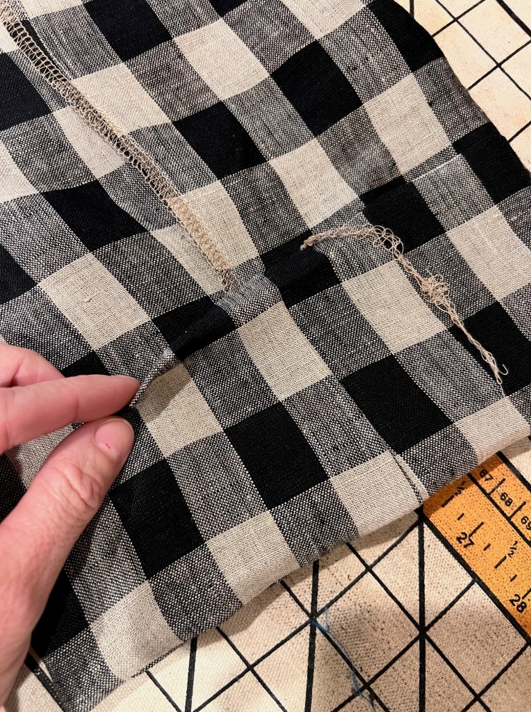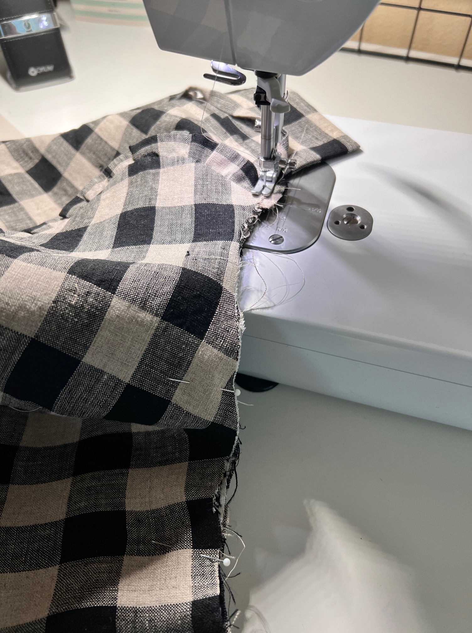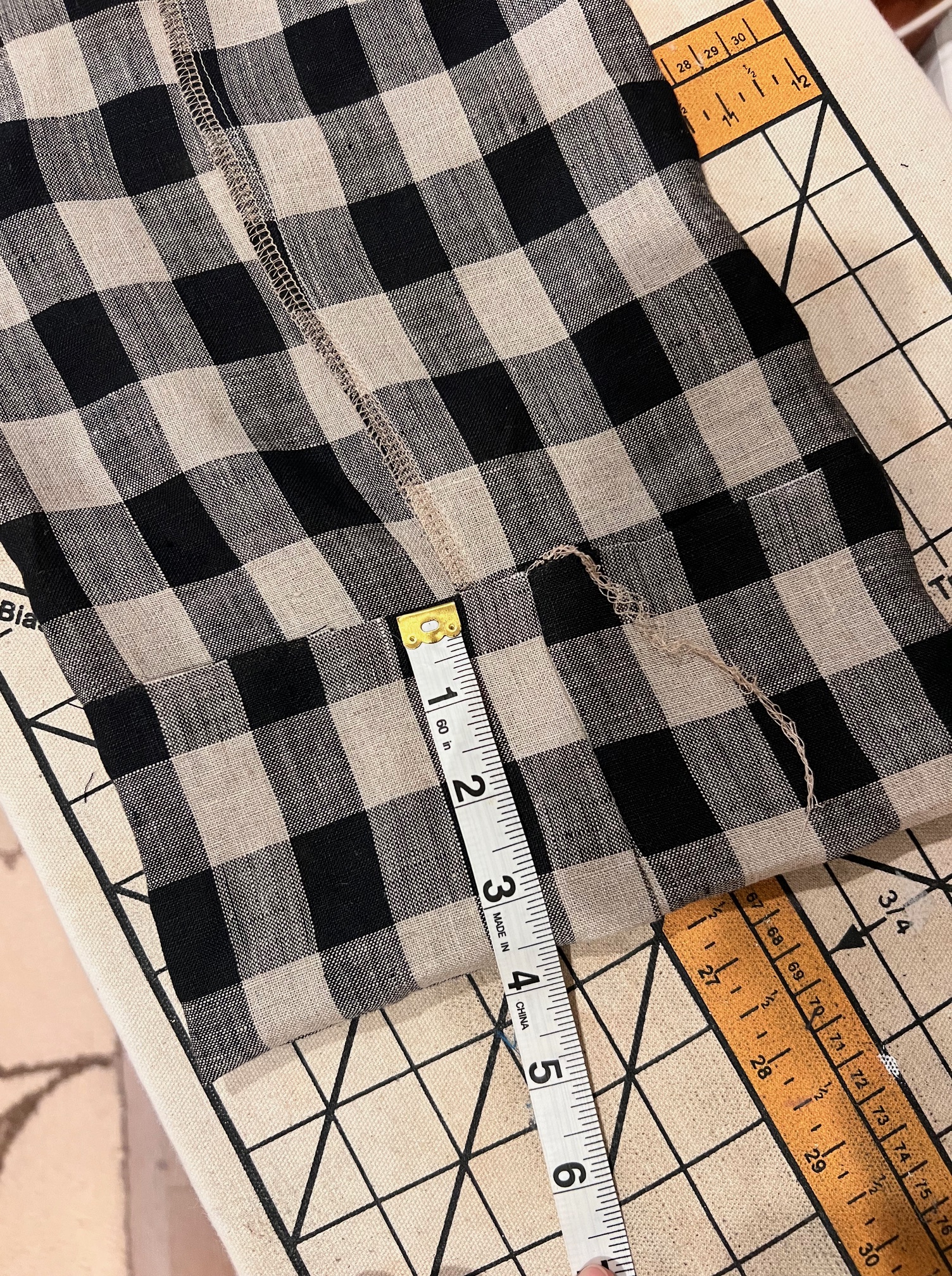 Try it on at this point and see how long everything is looking on the sleeve. I pinned my raw sleeve edge up at 4 1/2″ inches to check the length and it was perfect. Once you have decided on the length, turn the sleeve inside out.