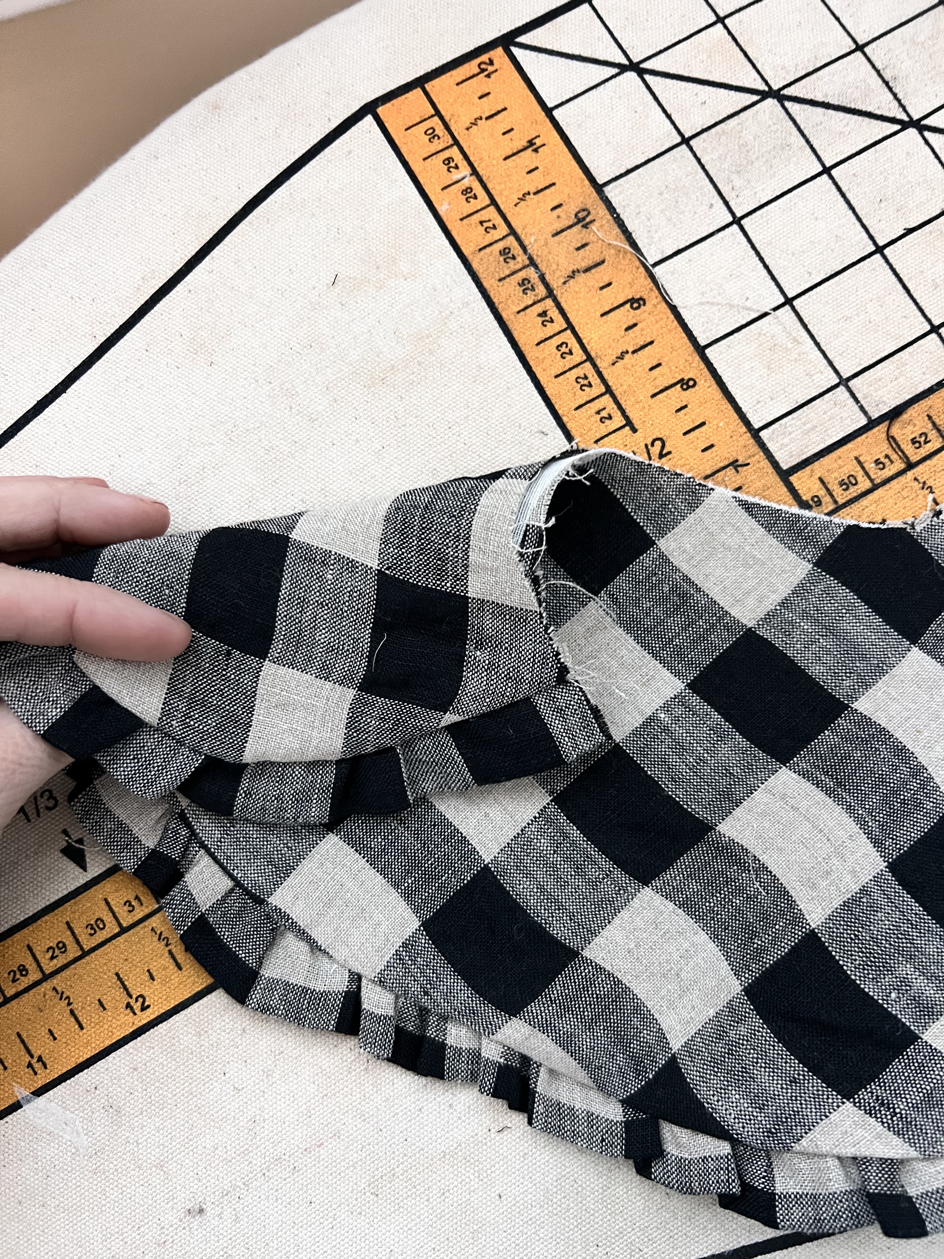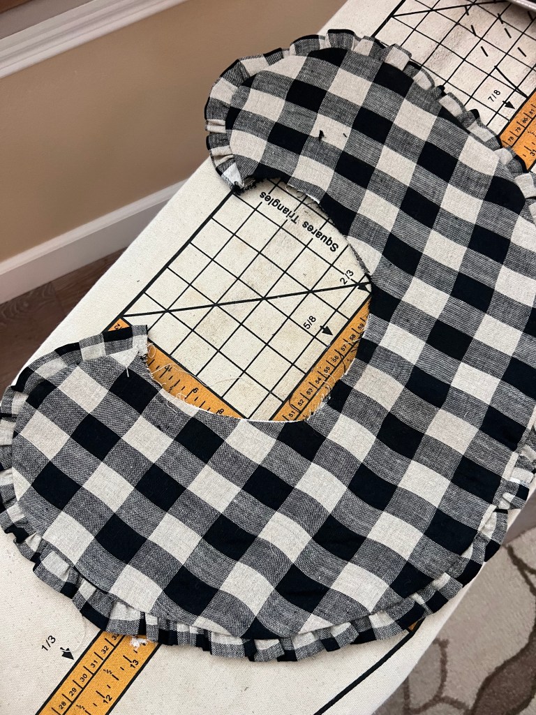 Now let’s prep the gathered trim! Your trim should be the length of the outside curve of the collar x2. So my collar measured 21″ x 2 (because thats only half of the collar) so 42″ around. Now we need to multiple that by 2 again to account for extra fabric to create beautiful gathers around the collar. So now we have 84″. You can also cut this piece on the fold to account for fabric width, so we will divide by 2. My finished piece ended up being 42″ x 2″ cut on the fold. I wanted my trim to be about 1/2″ long, if you wish to have more trim showing you can adjust the 2″ measurement for width. Your collar measurement may be bigger or smaller depending on your collar design. I just used the same trim piece we just calculated for my smaller collar, but to be more accurate you could adjust the length as needed. It will measure slightly smaller.