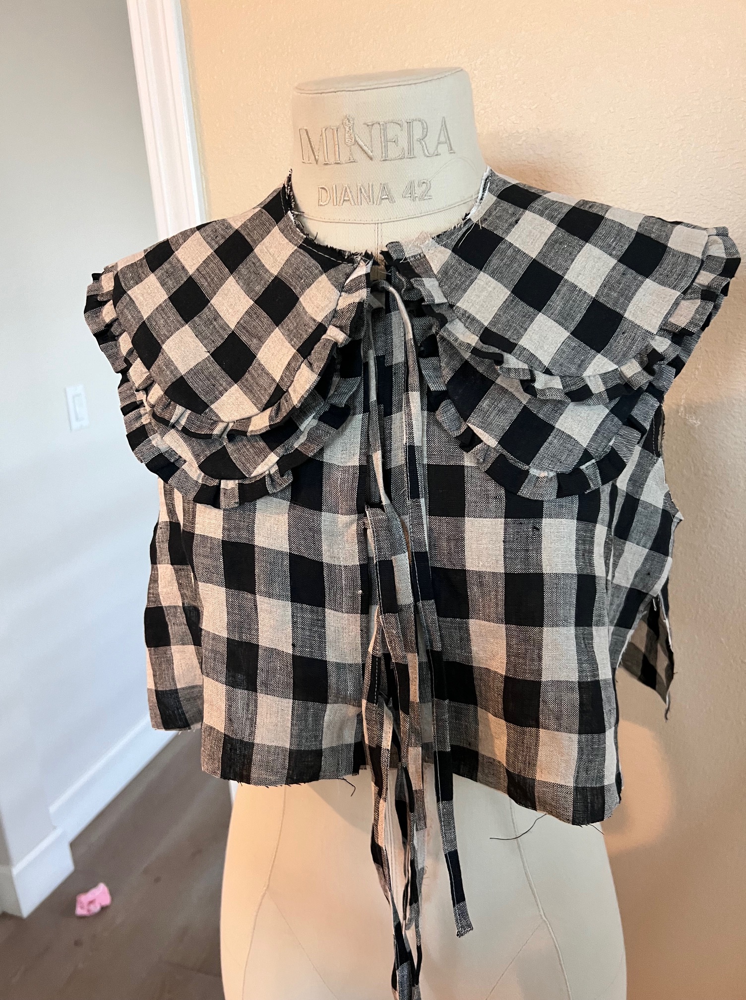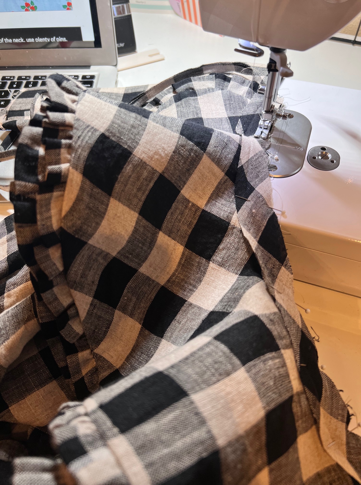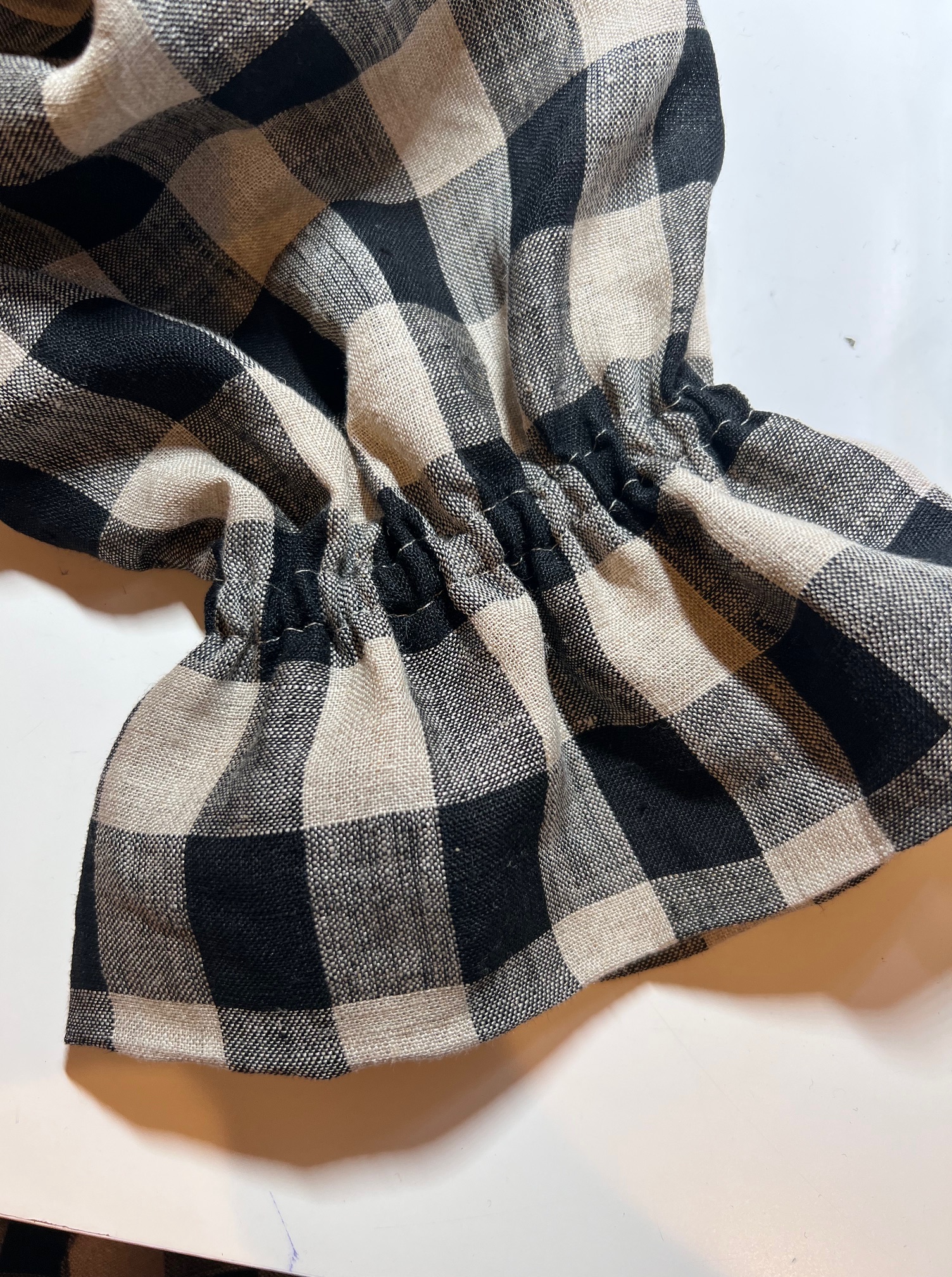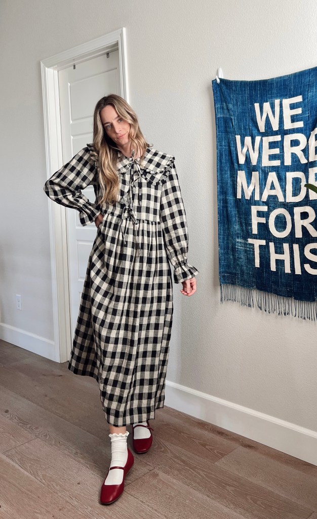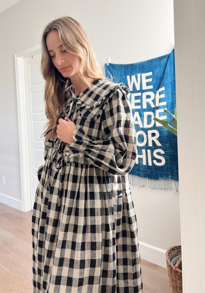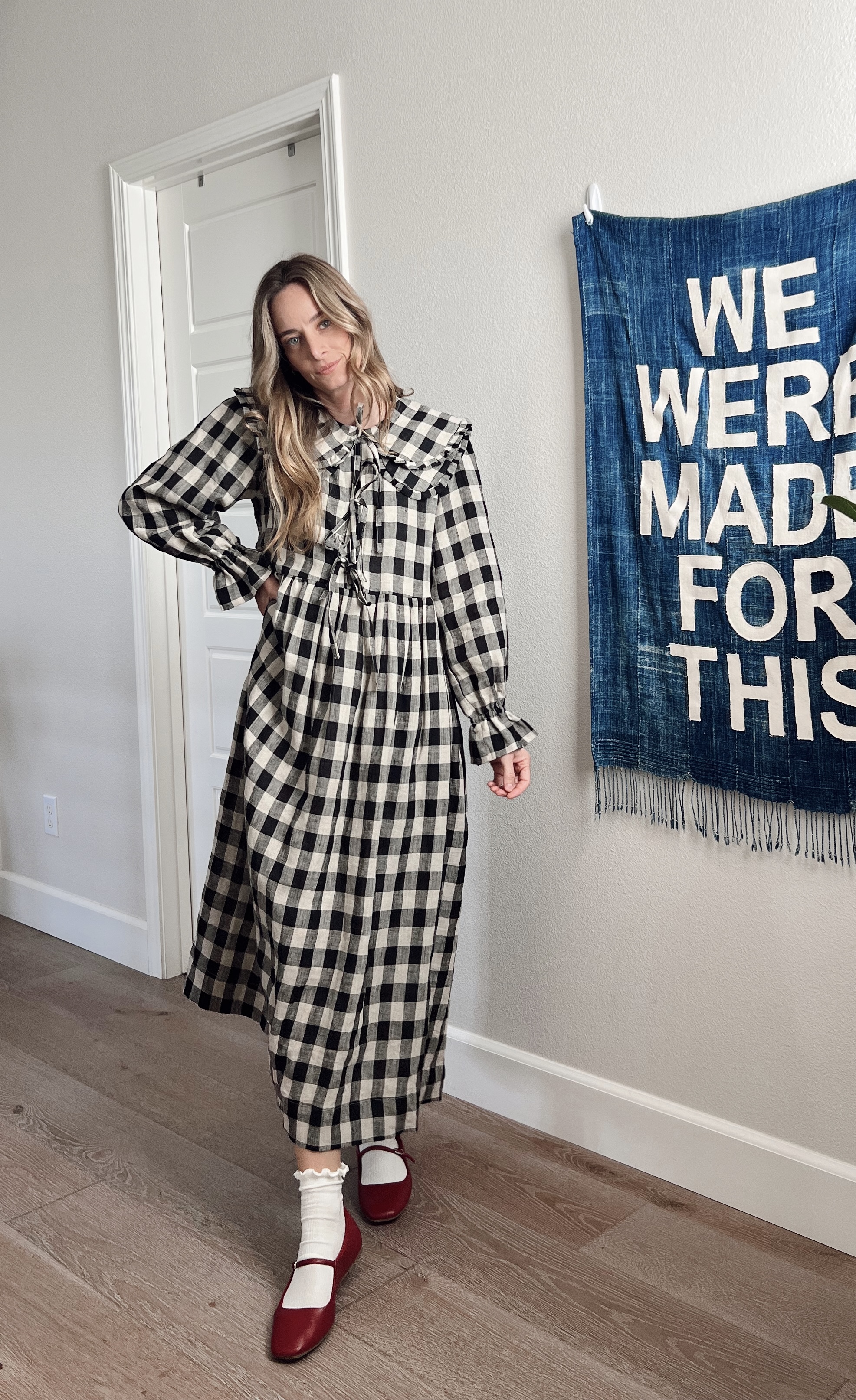 Happy Holidays everyone! I’m back with the perfect winter dress! I’ve made the Fleur blouse two times now, and when I recently saw Josie of Fabric God Mother’s Fleur top with a collar hack, I fell in love. I was also inspired by Damson Madder’s double collar top. Matchy Matchy Sewing Club’s gorgeous Large Gingham in black and tan linen just screams please make me into a winter dress! So here we are!