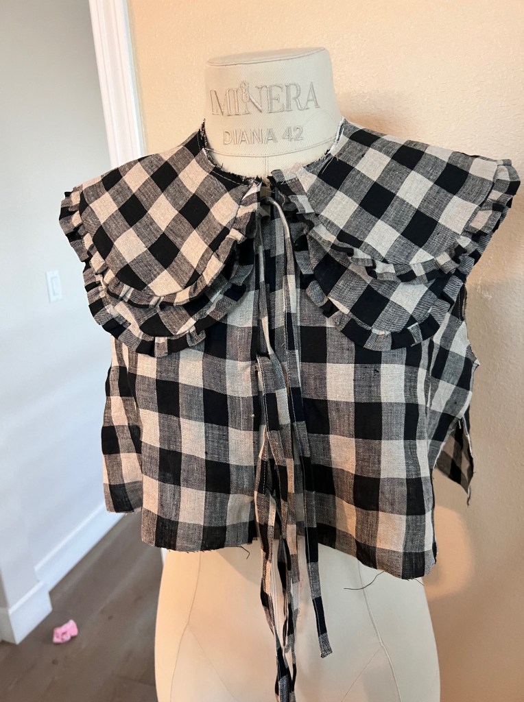 I made a few alterations to create this dress! I’m here today to walk you through what I did and how I did it! First, I hand designed two collars, one slightly bigger than the other to layer on top of one another on the neckline of the bodice. I also lengthened and straightened out the sleeve to create a long sleeve with an elasticated ruffle cuff finish. I made the size 8.