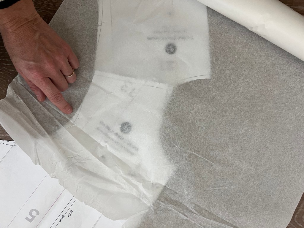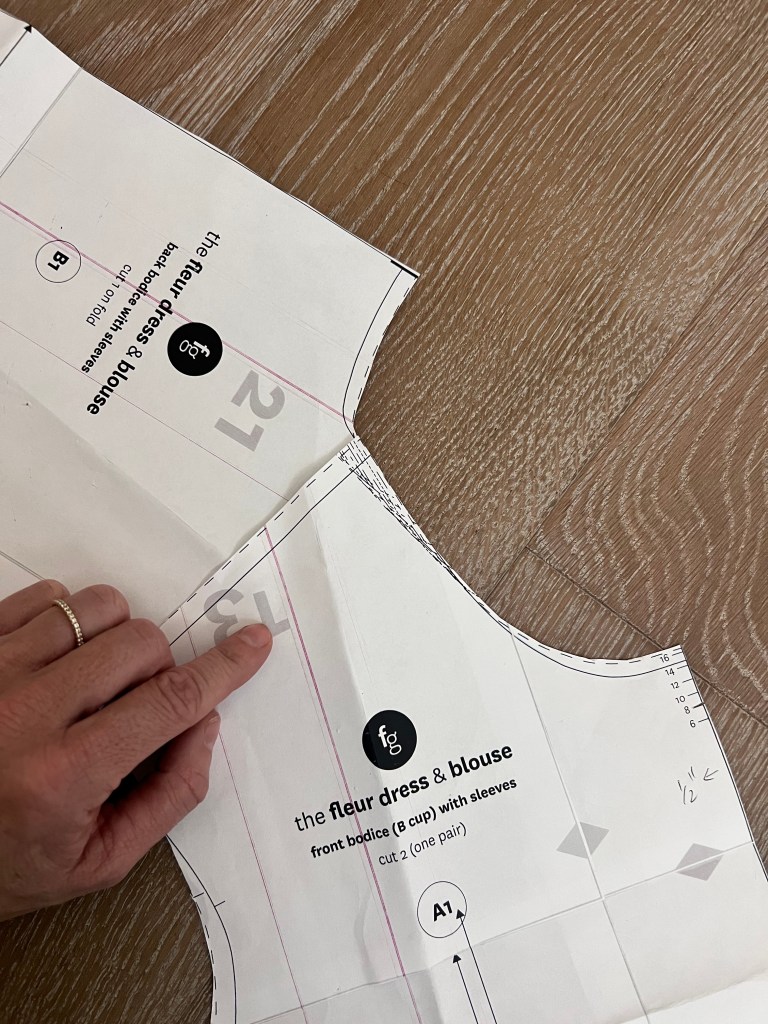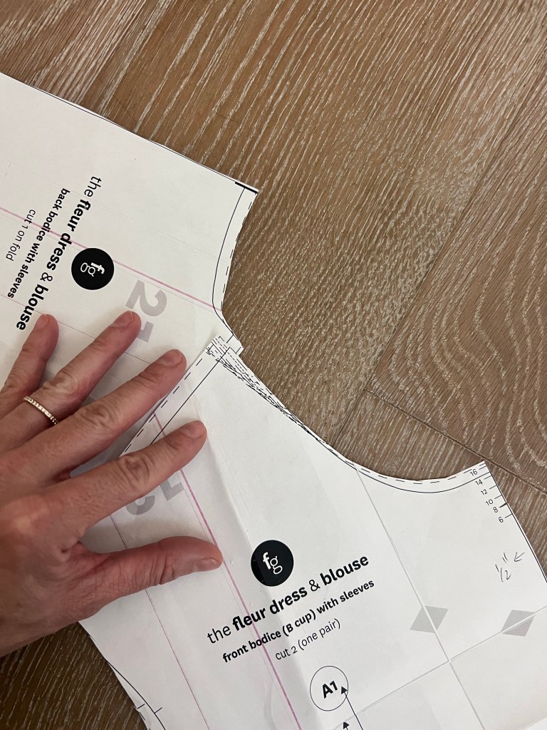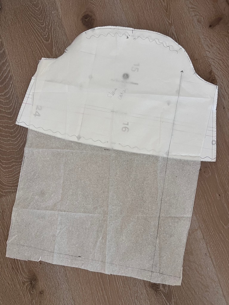 Based off Josie’s instructions in her video, she mentioned she extended the sleeve and also made it more narrow, this is what I did! Laying tracing paper over the sleeve, I traced the sleeve cap to the underarm corner. From there I took the sleeve straight down instead of out like the original sleeve pattern. My arm measures 21″ from my shoulder notch to wrist bone. I added 6″ to account for the elastic gathered sleeve finish.