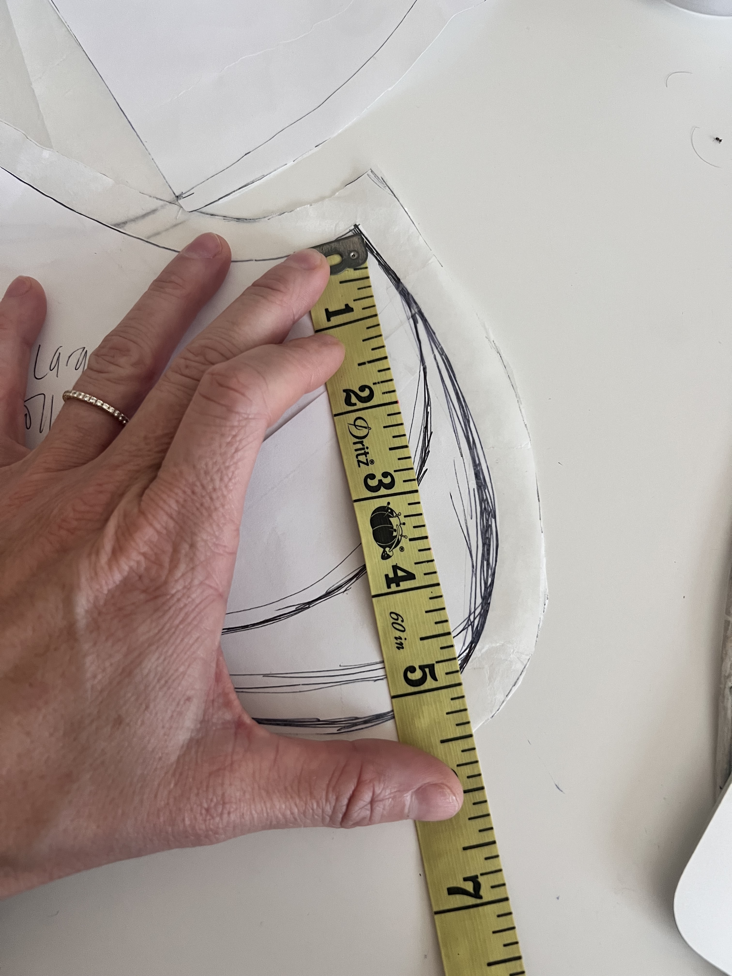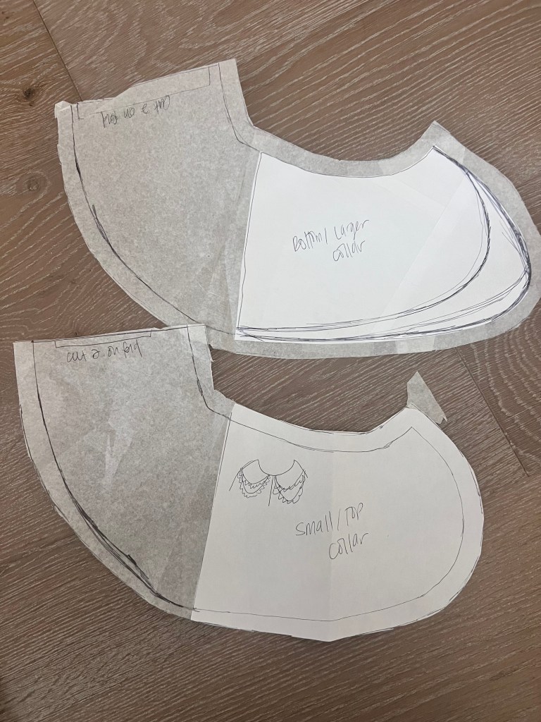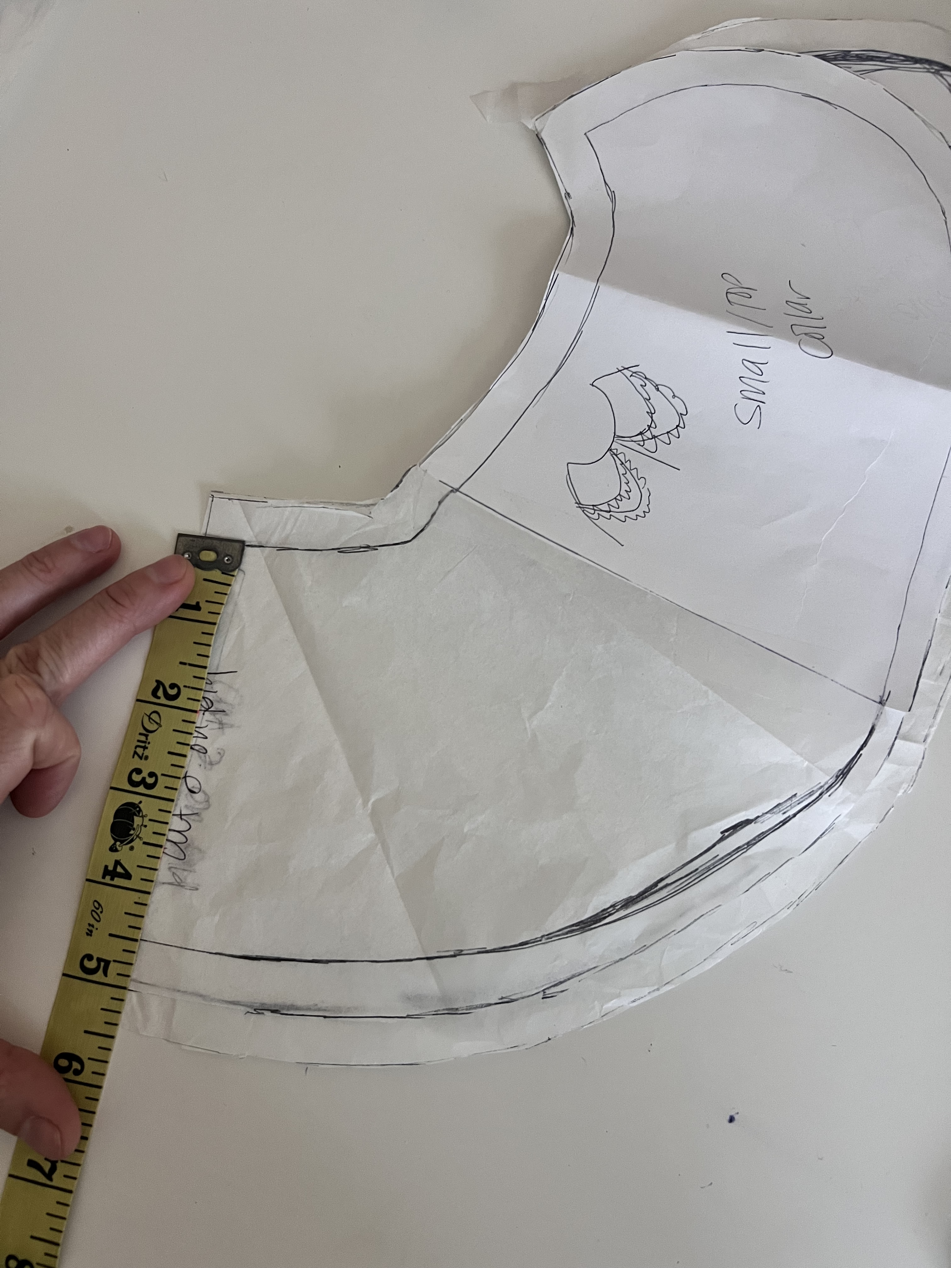 Next, I hand drew my collar design, making two collars. My top collar measured 4 1/2″ along the back fold line, and my bottom collar measured 5″. I wanted my bottom collar to have a slightly different shape from the top collar. I will share a photo below with a measuring tape to show the difference in shape. Then, make sure to add the seam allowance all the way around except for the fold edge, I added 1/2″ seam allowance. I traced the top collar onto the bottom collar pattern piece to get a visual of what the finished collars would look like on top of each other.