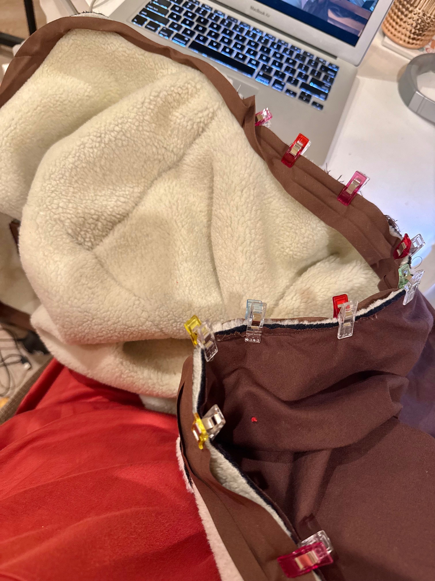 I used a teddy fleece fabric I ordered last spring from Beglarian Fabrics. I used a chocolate brown Kona Cotton fabric for my lining. I used the Jakob Jacket pattern from Sewing Machine, and made the size C in the long version. I omitted the collar for this version, and made no pattern adjustments or changed anything other than cutting off about 1.5-2″ from the sleeve length and sewing in buttonholes instead of using snaps.