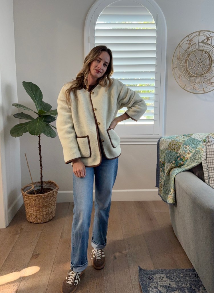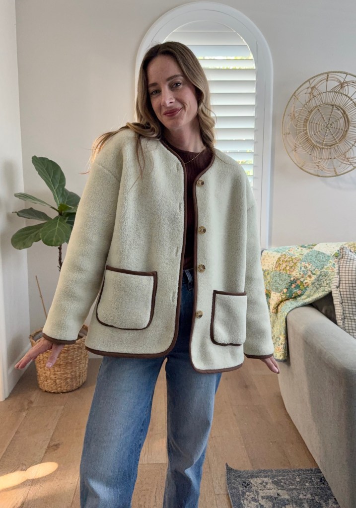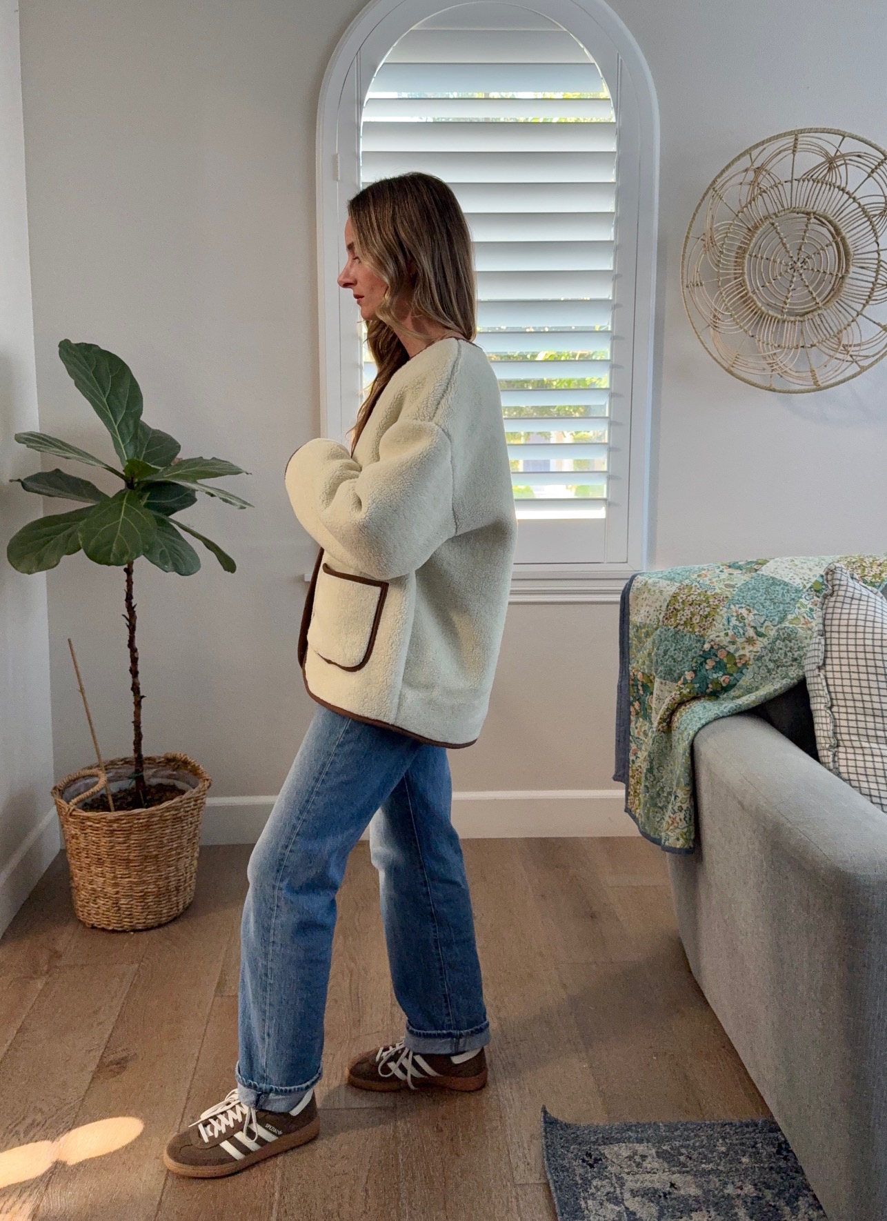 Teddy fleece jackets have been trending since last winter, and I’m seeing them even more full force this fall. I really love the oversized fit of the Jakob Jacket by Sewing Machina, and I knew it was a perfect match for what I envisioned. I wanted a simple drop sleeve jacket with a bias bound finish, simple pockets and button closures.